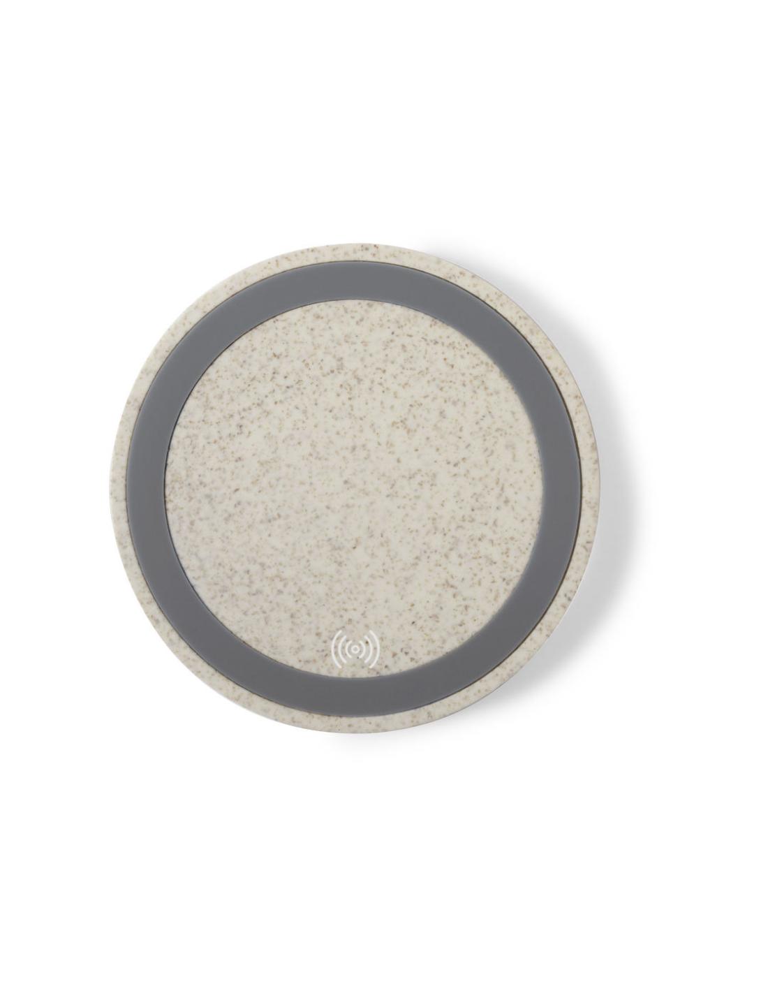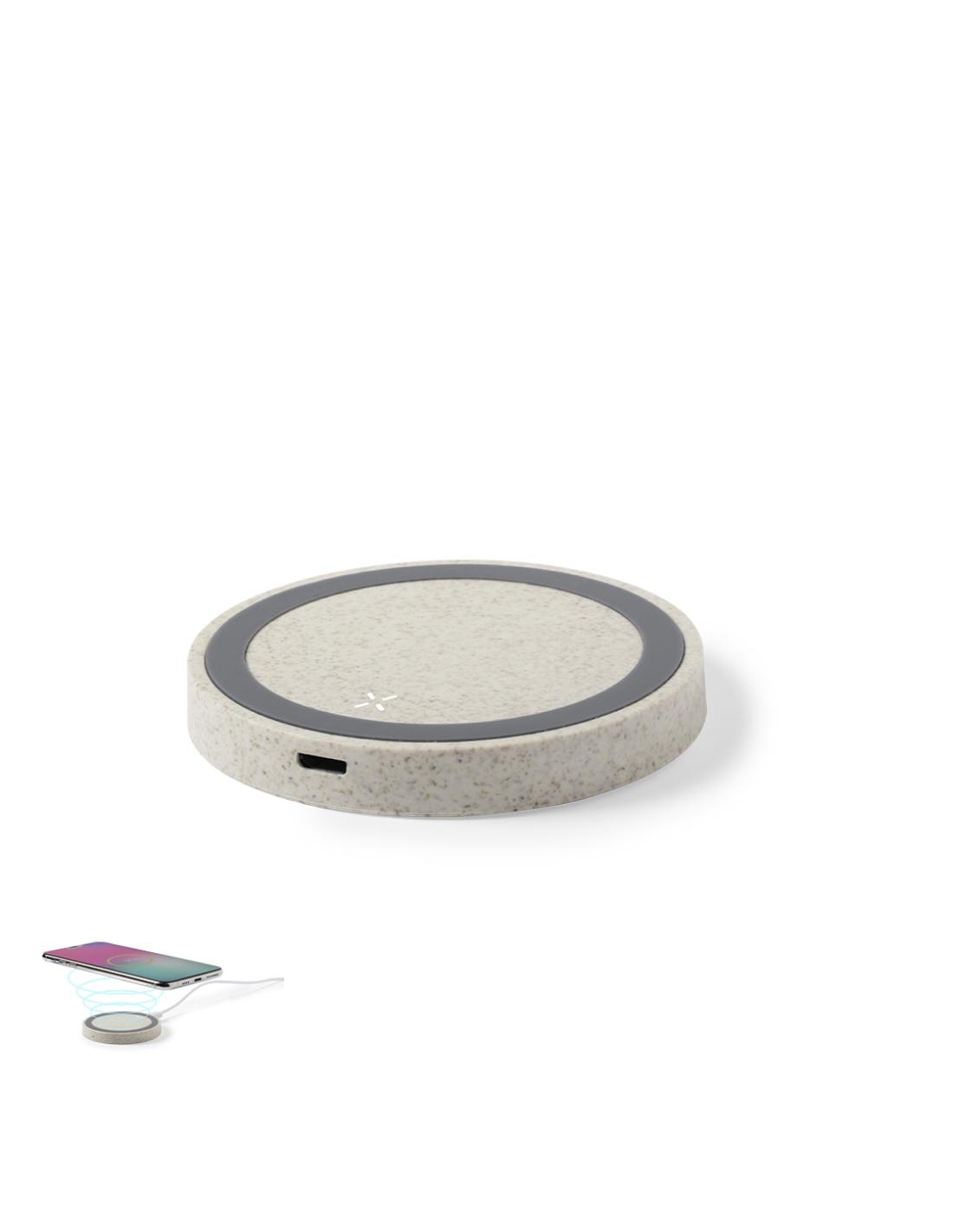 Cargador inalámbrico circular de línea nature. Carcasa en caña de trigo, para así fomentar la utilización de materias primas naturales y reducir las emisiones contaminantes. Con base antideslizante e indicador LED de estado de carga. Compatible con smartphones con tecnología de carga inalámbrica y presentado en atractiva caja de diseño eco.