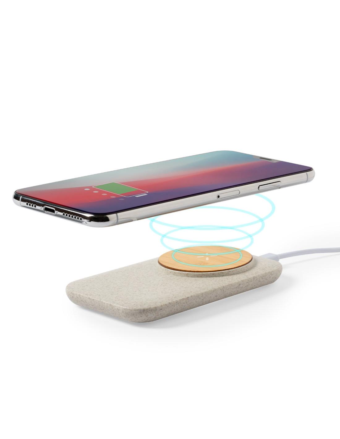 Cargador inalámbrico de línea nature. Hecho en bambú en combinación con caña de trigo, para así fomentar la utilización de materias primas naturales y reducir las emisiones contaminantes. Indicador de estado de carga y compatible con dispositivos equipados con tecnología de carga inalámbrica. Amplia superficie de marcaje y presentado en atractiva caja de diseño eco. Cable incluido.