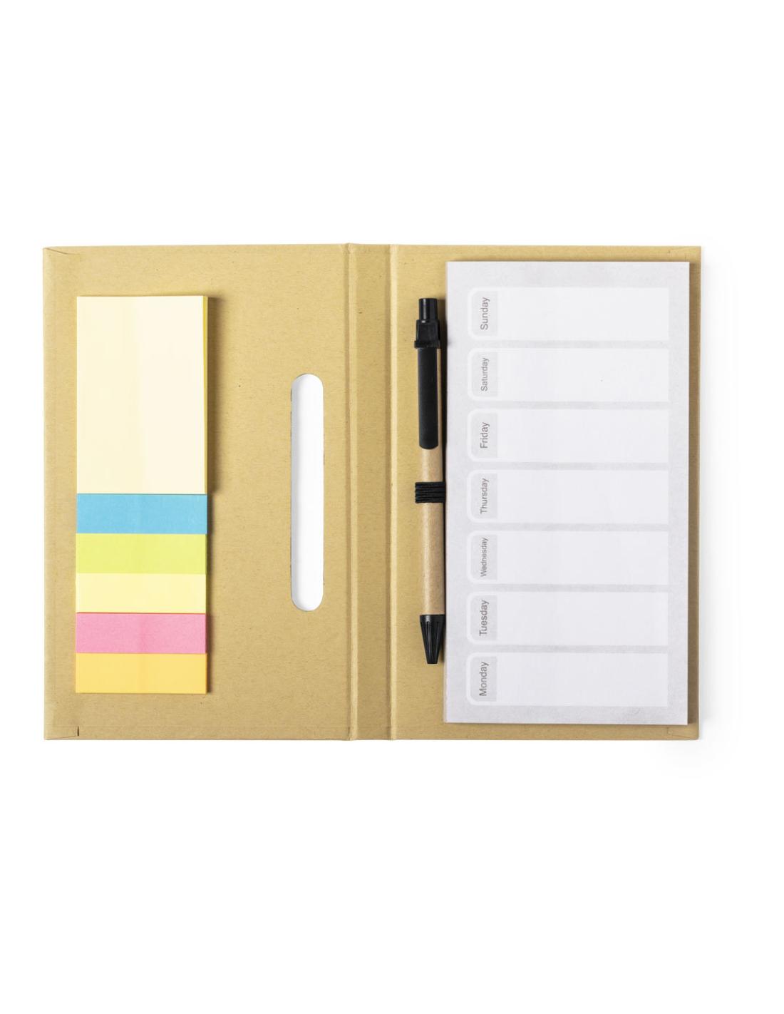 Set de bloc de notas y bolígrafo en línea nature con planificador semanal perpetuo. Tapas rígidas en cartón reciclado con soporte para bolígrafo y 60 hojas de planificación semanal. Incluye 25 notas adhesivas medianas y 125 mini-notas adhesivas. Con bolígrafo de mecanismo pulsador y cuerpo en cartón reciclado-tinta azul-.