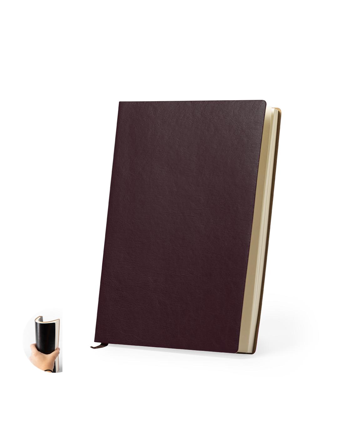 Bloc de notas con suaves tapas en polipiel de acabado flexible. 100 hojas con disposición a una raya y marcapáginas de tela a juego. Disponible en sobrios colores