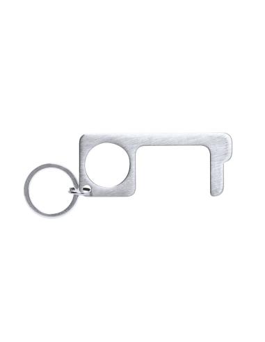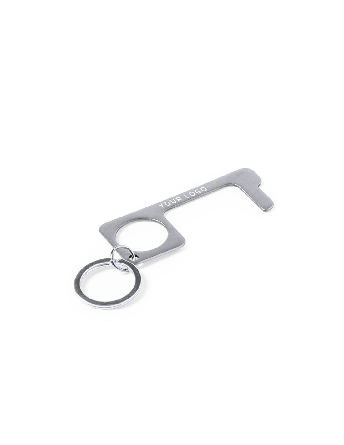 Llavero higiénico anti-contacto, fabricado en resistente acero inox. Especialmente diseñado para evitar tocar con las manos superficies de uso común (picaportes de puertas, interruptores, grifos de uso público, cajeros automáticos...). Con cómodo troquel para el dedo y presentado en bolsita individual. Recomendado para marcaje en láser.