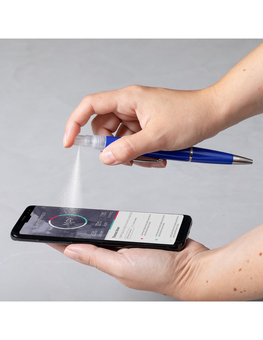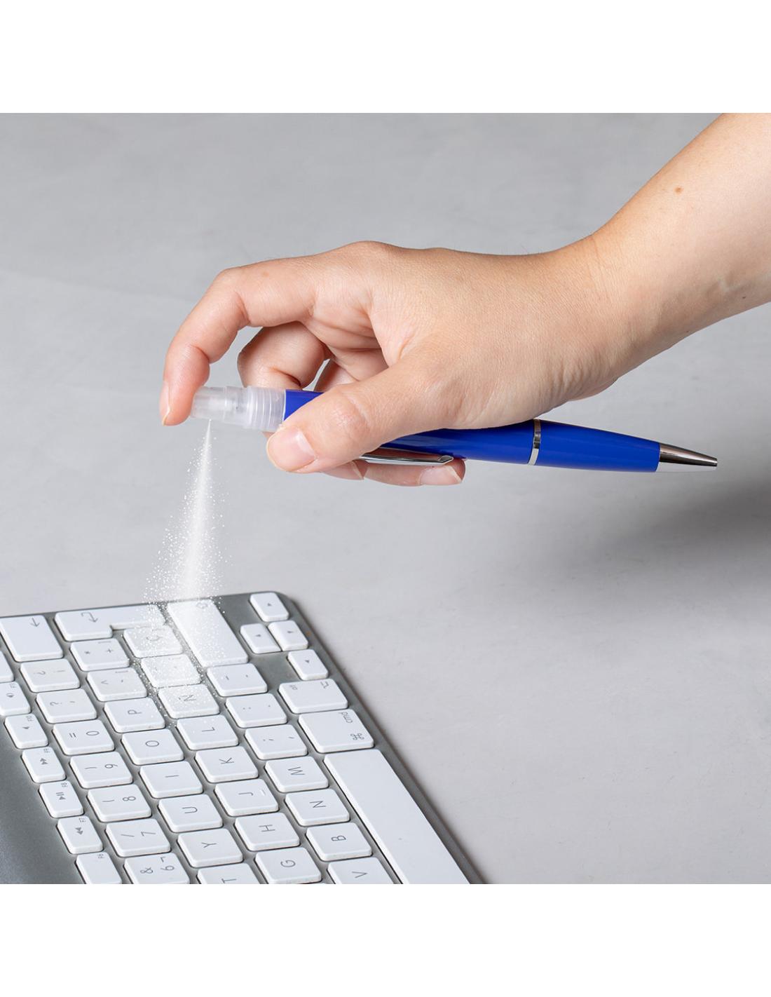 Bolígrafo higienizante con pulverizador recargable integrado y capucha protectora. Acabado en resistente ABS brillante con elegante clip metálico y cómoda empuñadura y escritura en tinta azul. Capacidad del pulverizador 3ml. Líquido no incluido. Disponible en amplia y variada gama de colores.