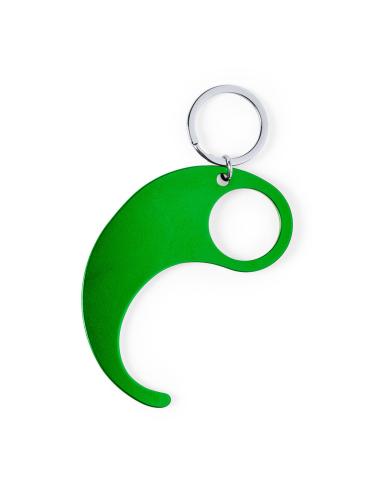 Llavero higiénico anti-contacto, fabricado en resistente Aluminio. El único llavero diseñado especialmente para uso en transporte público y evitar tocar con las manos superficies de uso común (picaportes de puertas, interruptores, grifos de uso público, cajeros automáticos...). Dispone de amplia zona de marcaje y cómodo troquel para el dedo. Acabado en aluminio en vivos y variados colores. Presentado en bolsita de diseño individual.