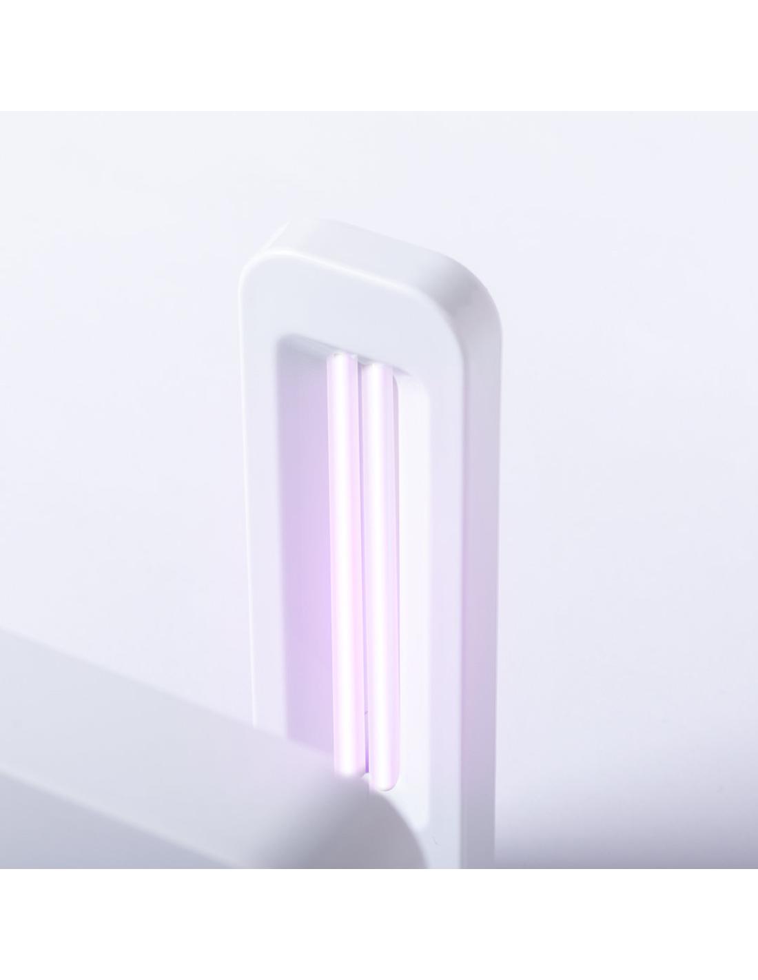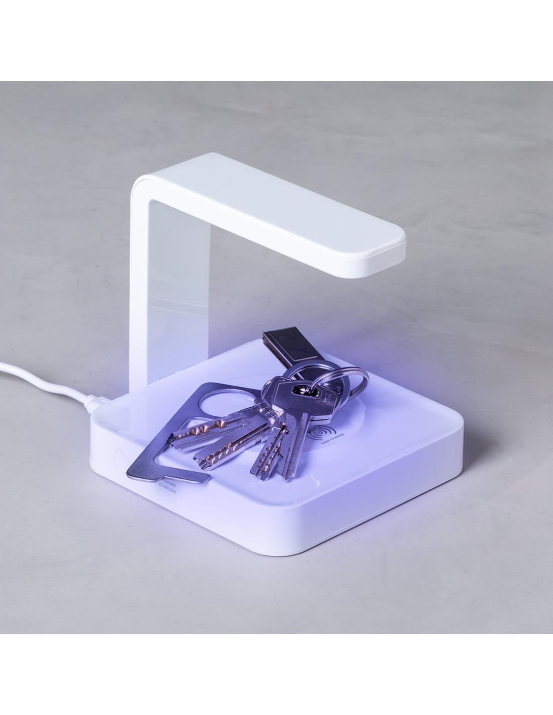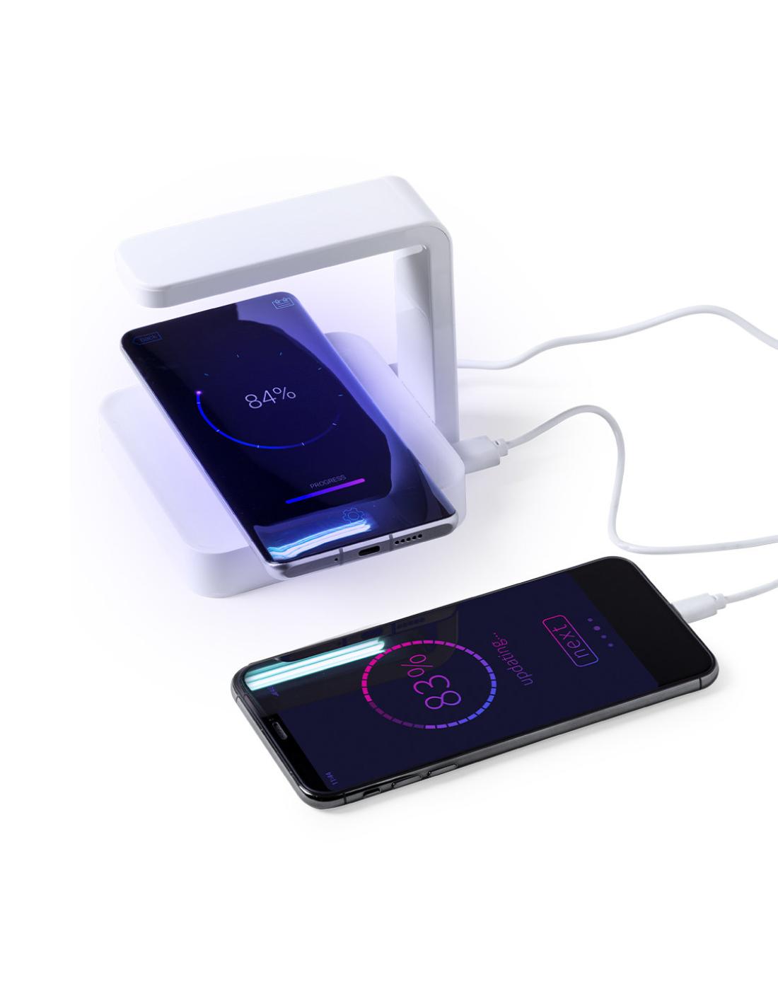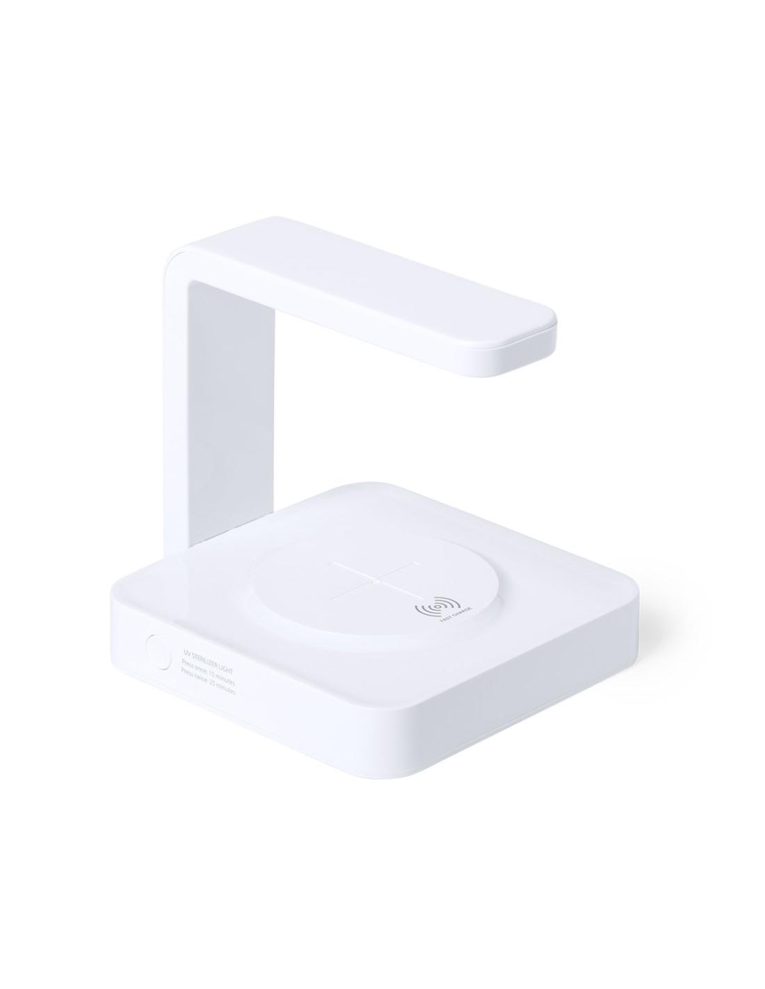 Lámpara esterilizadora de luz ultravioleta tipo C con cargador inalámbrico integrado para smartphone. Especialmente diseñada para la eliminación de microorganismos y bacterias en objetos de uso cotidiano como el smartphone, llaves, gafas, mascarilla, auriculares, smartwatch… Fabricada en resistente material ABS de acabado brillante y presentada en atractiva caja individual de diseño. Fácil de usar, basta con situar el objeto a esterilizar en la base de la lámpara. Potencia de salida 2,5W y longitud de onda de 254 nm. Salida USB de 1000 mA, con función de carga rápida 10W y cable micro USB incluido a juego de 1 metro de largo. Tiempo de esterilización de 15 y 25 minutos con función autoapagado. Disponible manual de usuario en español e inglés. Disponible certificación CE, RoHS y de efectividad germicida.