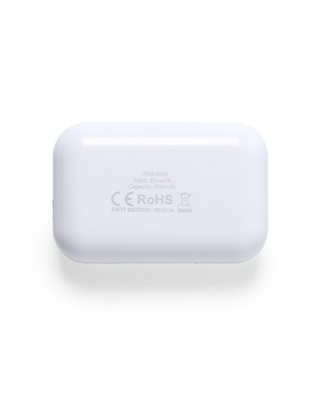 Auriculares antibacterianos intraurales en elegante acabado blanco y conexión Bluetooth 5.0. Fabricados en resistente material ABS brillo y de diseño ergonómico, incluyen botón de control táctil integrado en el auricular, con base de carga a juego. Función manos libres y recargables, con cable micro USB incluido. Presentados en estuche individual de lujo con tapa de bisagra y en atractiva caja de diseño. Los productos con tratamientos antibacterianos son capaces de reducir drásticamente las cargas bacterianas presentes en las superficies de los materiales, gracias a la incorporación de agentes microbianos permanentes estáticos, con alta efectividad para inhibir y prevenir la contaminación bacteriana. Artículo de acuerdo al estándar ISO 22196, que determina la actividad antibacteriana en materiales plásticos...