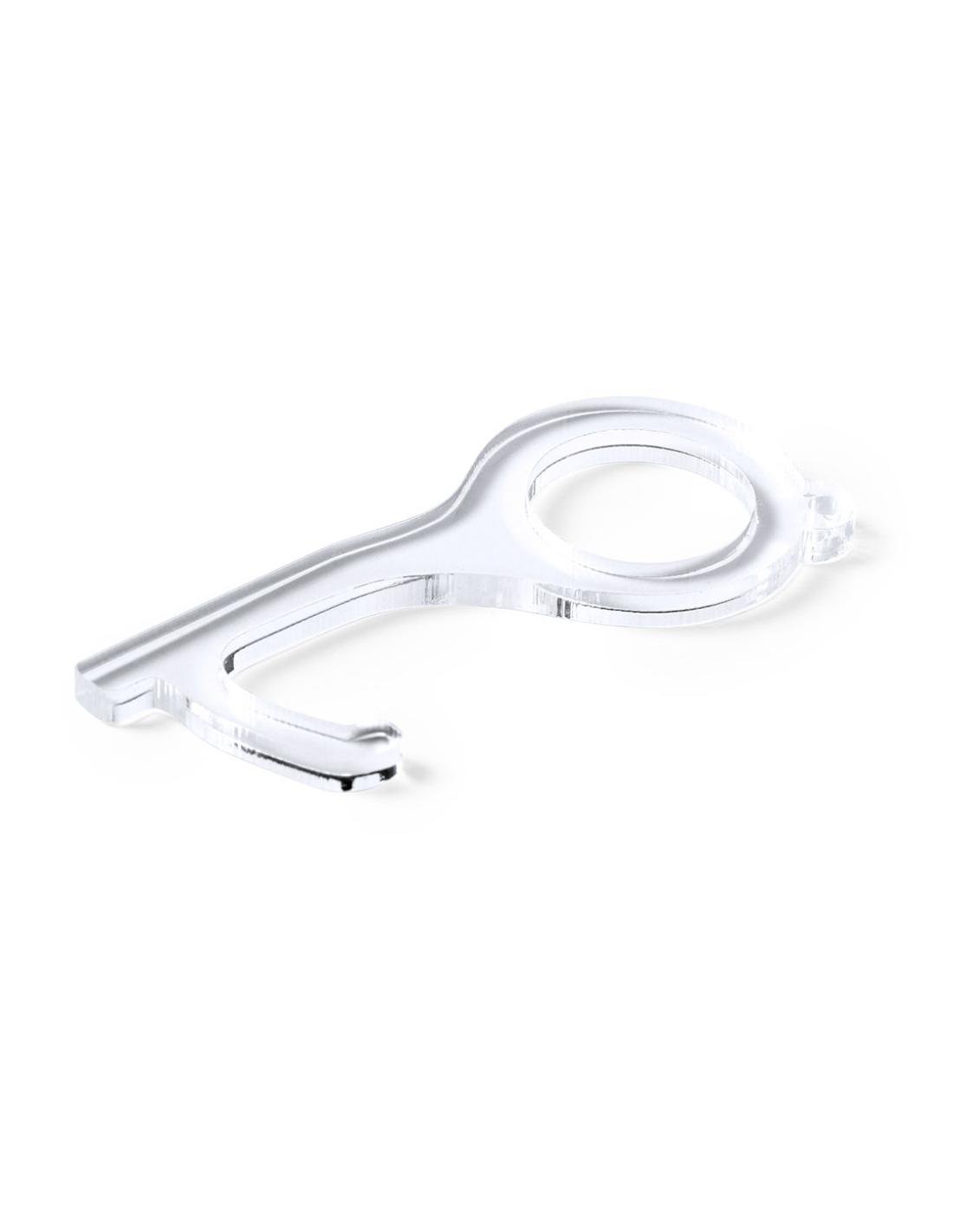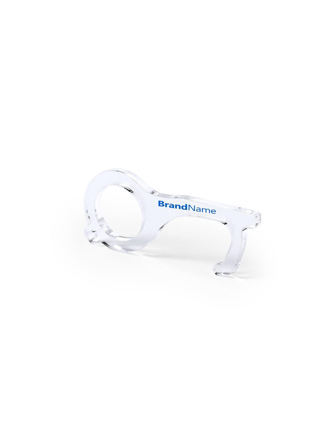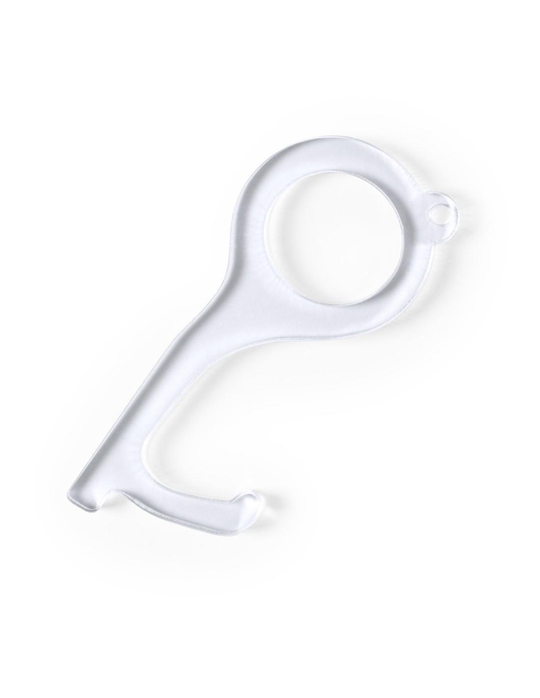 Llavero higiénico anti-contacto, fabricado en original y resistente material acrílico de acabado transparente. Especialmente diseñado para evitar tocar con las manos superficies de uso común (picaportes de puertas, interruptores, grifos de uso público, cajeros automáticos...). Con cómodo troquel para el dedo y presentado en bolsa individual de diseño. Recomendado para marcaje en tampografía.
