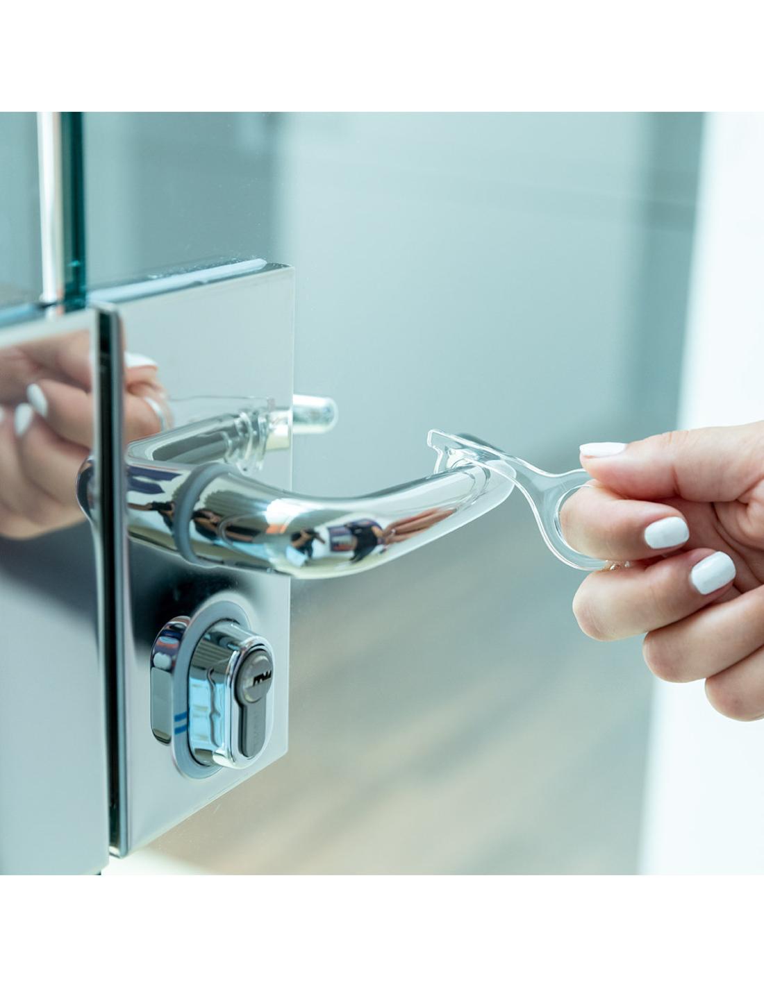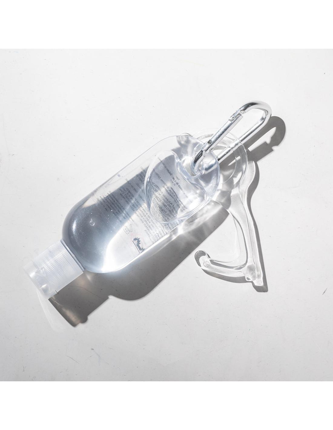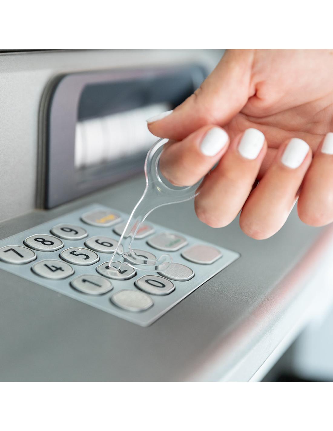Llavero higiénico anti-contacto, fabricado en original y resistente material acrílico de acabado transparente. Especialmente diseñado para evitar tocar con las manos superficies de uso común (picaportes de puertas, interruptores, grifos de uso público, cajeros automáticos...). Con cómodo troquel para el dedo y presentado en bolsa individual de diseño. Recomendado para marcaje en tampografía.