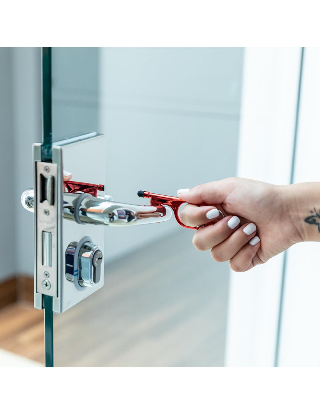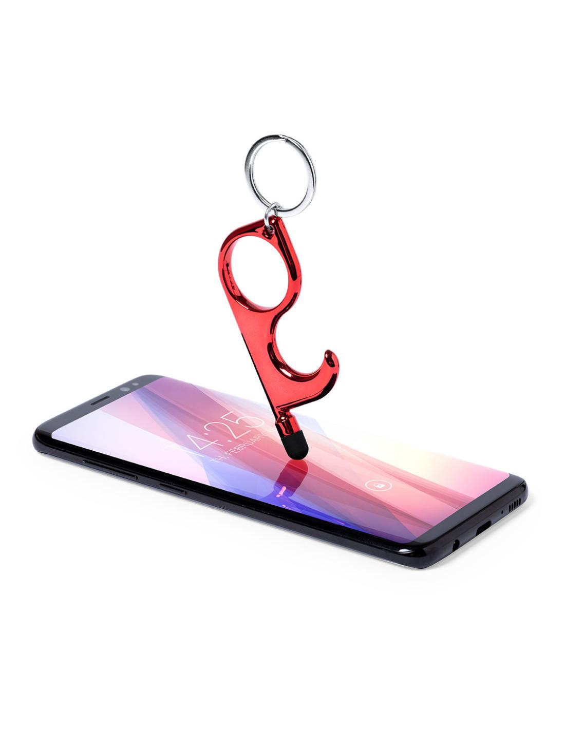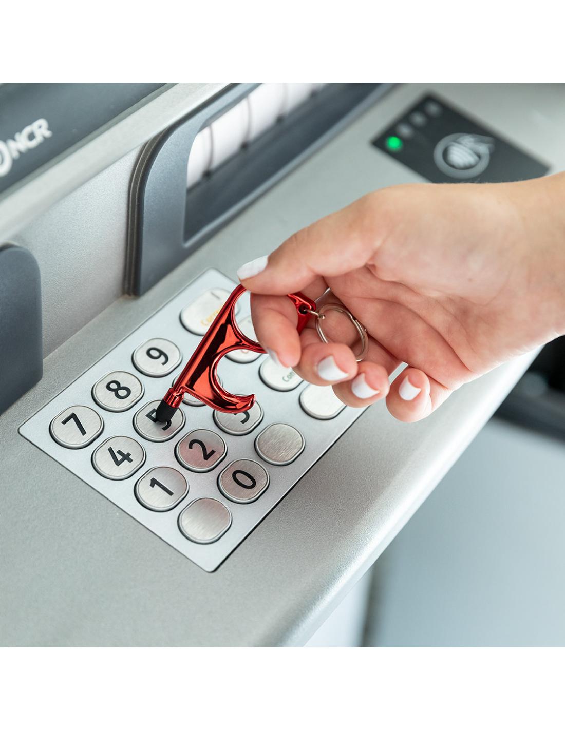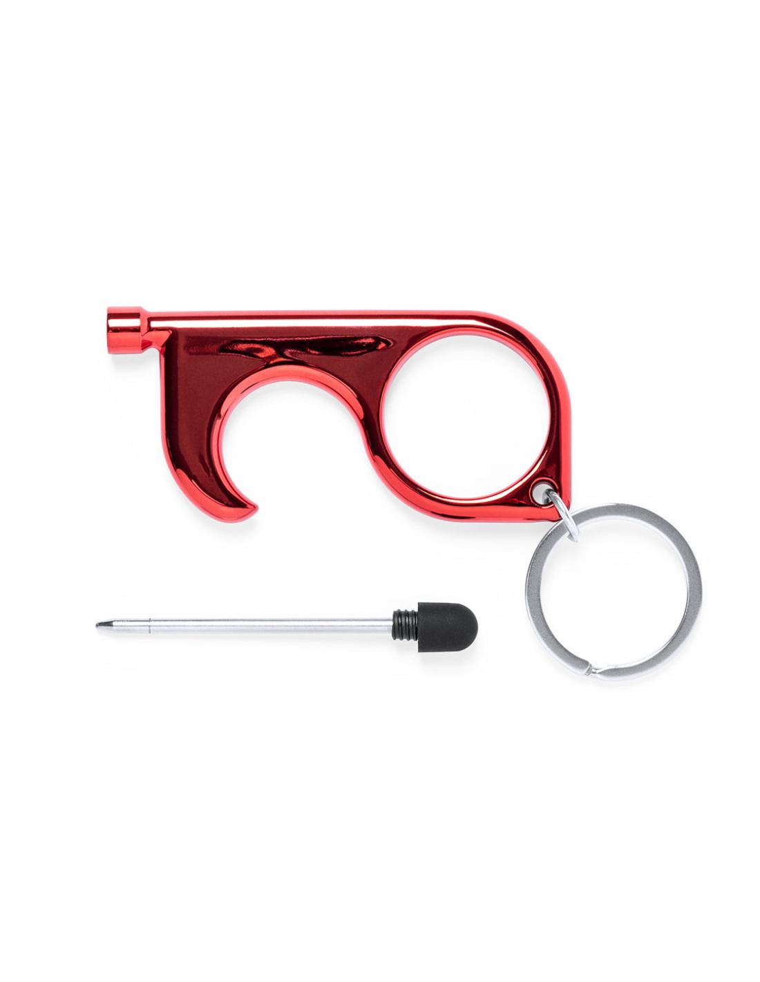 Llavero higiénico anti-contacto con bolígrafo y puntero integrados. Fabricado en resistente ABS de acabado metalizado y disponible en variada gama de colores. Especialmente diseñado para evitar tocar con las manos superficies de uso común (picaportes de puertas, interruptores, grifos de uso público, cajeros automáticos...). Con cómodo troquel para el dedo y presentado en bolsa individual de diseño. Recomendado para marcaje en tampografía.