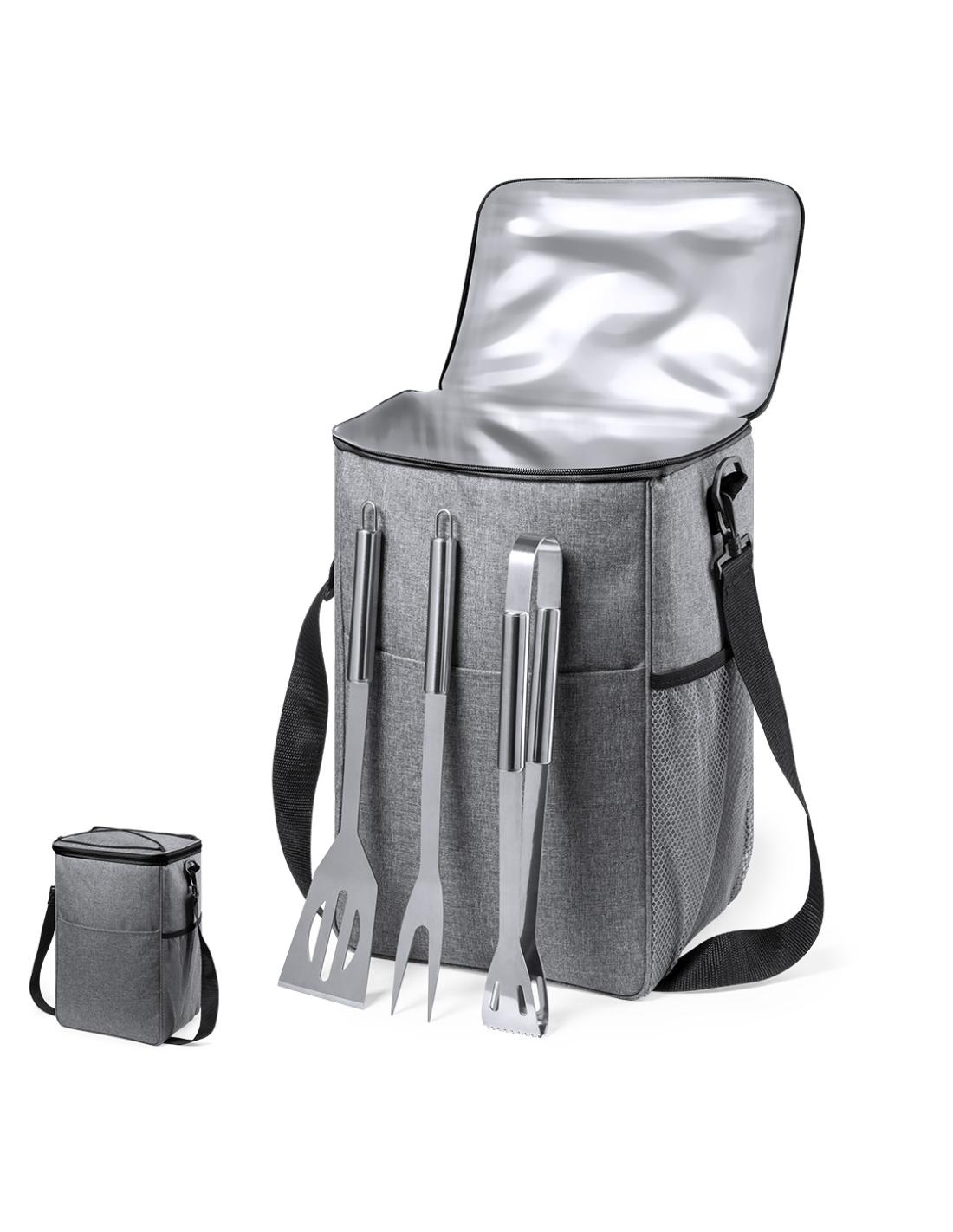 Set de barbacoa con 3 accesorios. Incluye: Bolsa de transporte/nevera fabricada en resistente poliéster RPET 300D, elaborado a partir de plástico reciclado, para así fomentar la reutilización de residuos plásticos y ayudar a la sostenibilidad del planeta. Con cinta para hombro ajustable de cierre de mosquetón e interior isotermo en PEVA, para conservar la temperatura de los alimentos. Distintivo RPET en etiqueta etiqueta exterior. Paleta, pinzas y trinchador metálicos, con mangos en color negro.