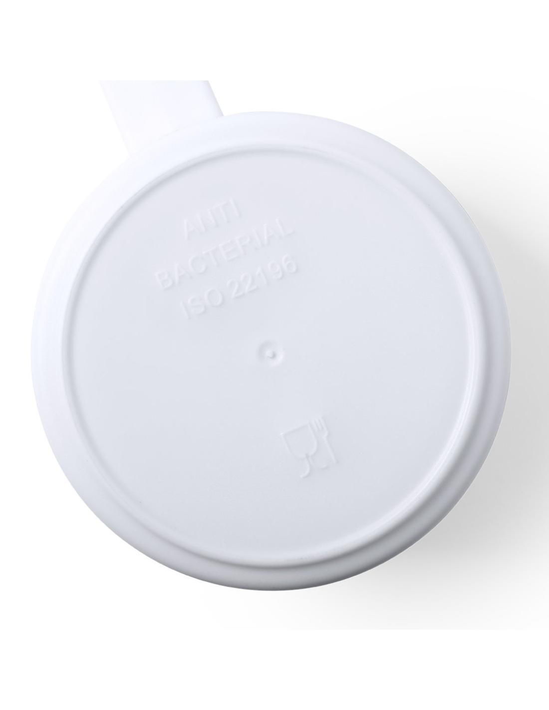 Taza antibacteriana en resistente material PP de acabado sólido y libre de BPA. 350 ml de capacidad, presentada en bolsa individual. Los productos con tratamientos antibacterianos son capaces de reducir drásticamente las cargas bacterianas presentes en las superficies de los materiales, gracias a la incorporación de agentes microbianos permanentes estáticos, con alta efectividad para inhibir y prevenir la contaminación bacteriana. Artículo de acuerdo al estándar ISO 22196, que determina la actividad antibacteriana en materiales plásticos y superficies no porosas, lo que permite conocer la efectividad de inhibición microbiana que tienen los aditivos sobre los objetos tratados mediante una evaluación cuantitativa.