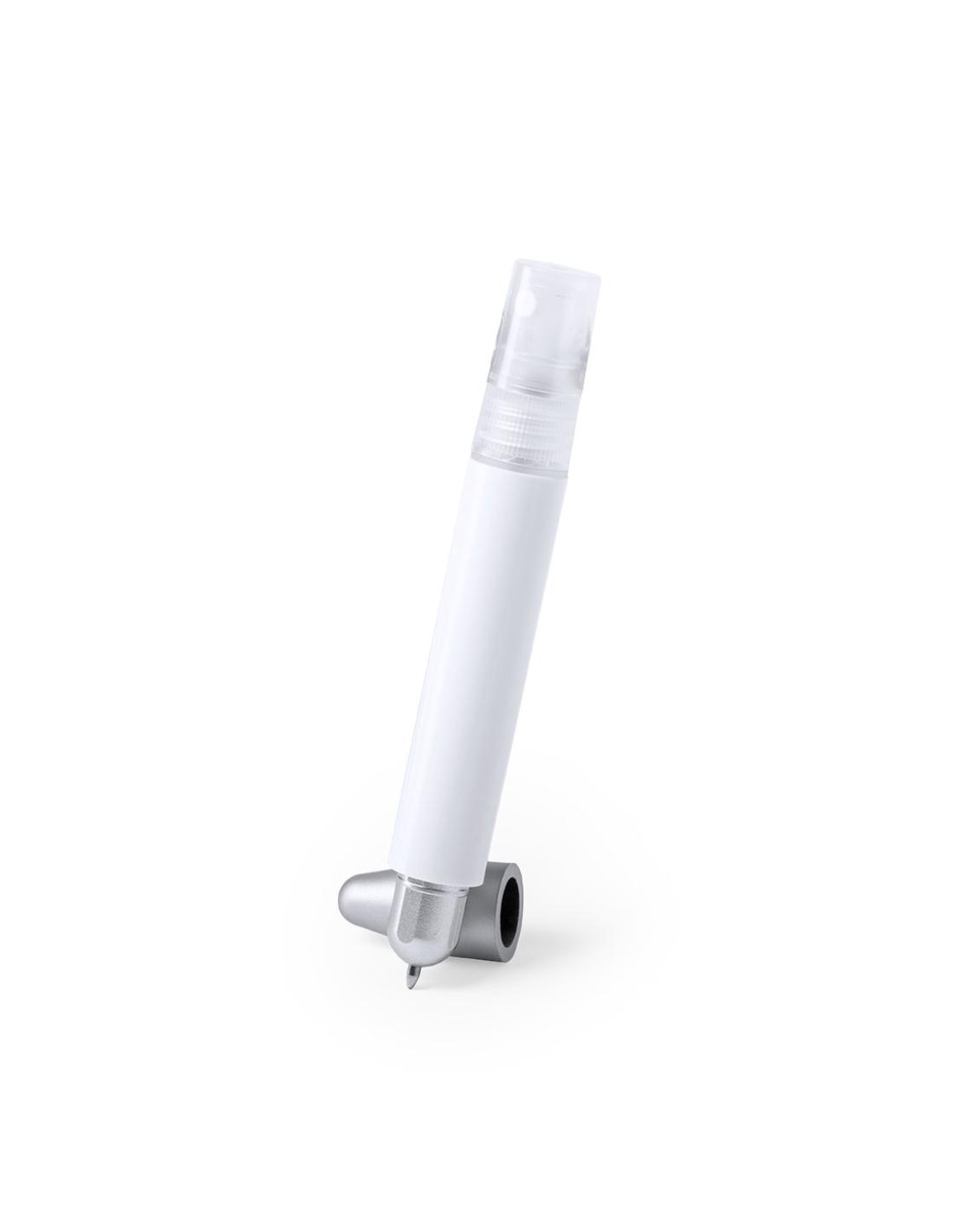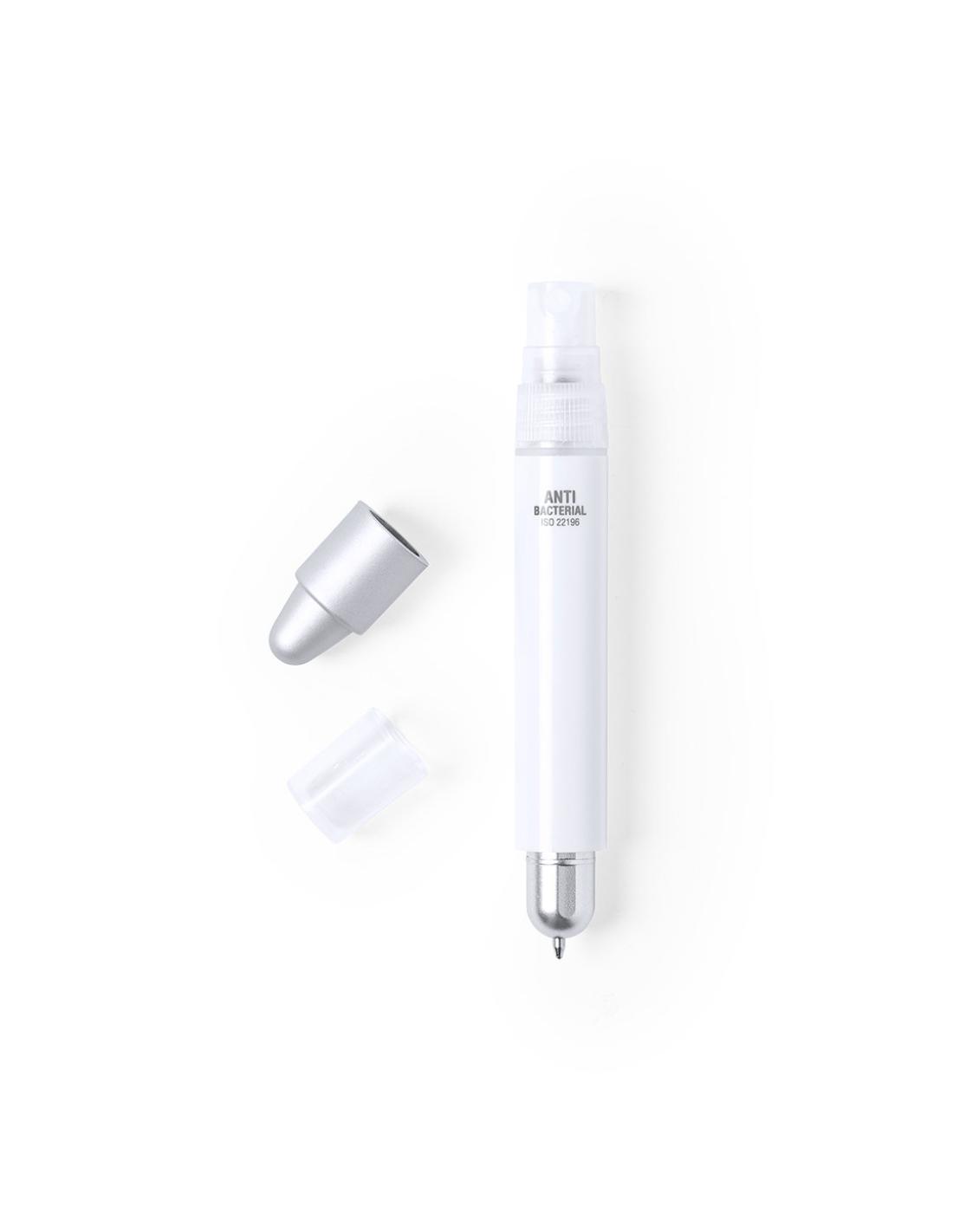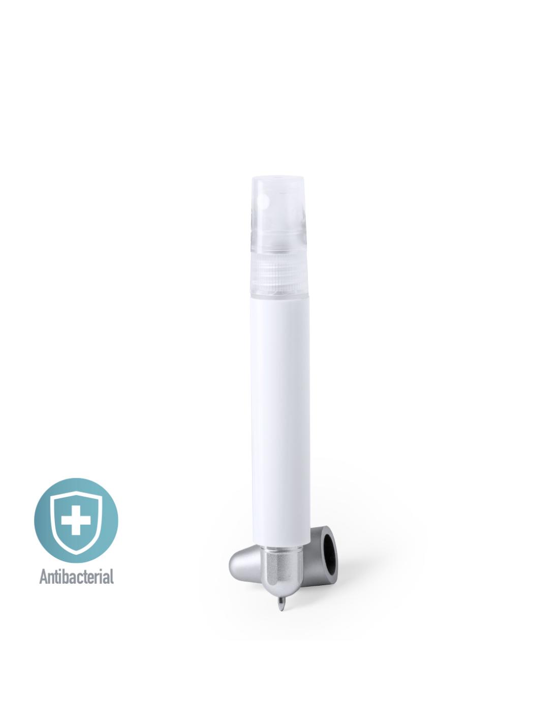 Bolígrafo antibacteriano con pulverizador recargable integrado y capucha protectora con puntero en color gris. Acabado liso en resistente ABS brillante con detalles cromados y escritura en tinta azul. Capacidad del pulverizador 3ml. Líquido no incluido.Los productos con tratamientos antibacterianos son capaces de reducir drásticamente las cargas bacterianas presentes en las superficies de los materiales, gracias a la incorporación de agentes microbianos permanentes estáticos, con alta efectividad para inhibir y prevenir la contaminación bacteriana.Artículo de acuerdo al estándar ISO 22196, que determina la actividad antibacteriana en materiales plásticos y superficies no porosas, lo que permite conocer la efectividad de inhibición microbiana que tienen los aditivos sobre los objetos tratados mediante...