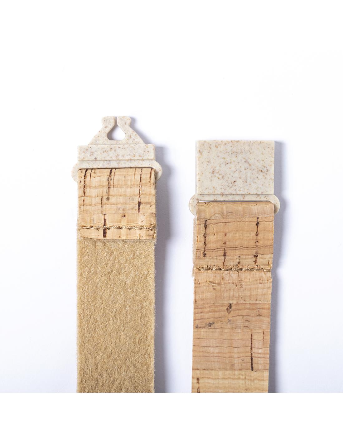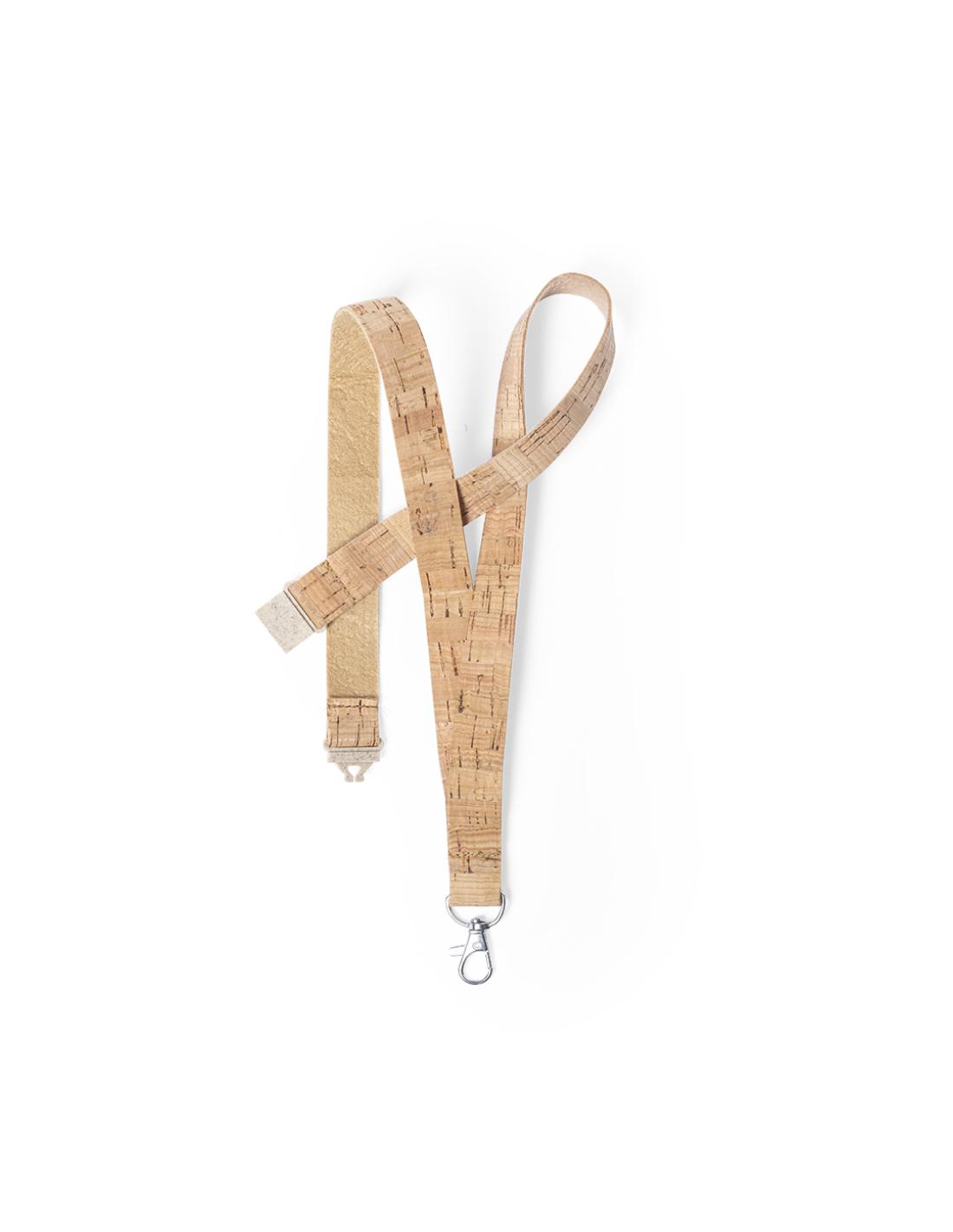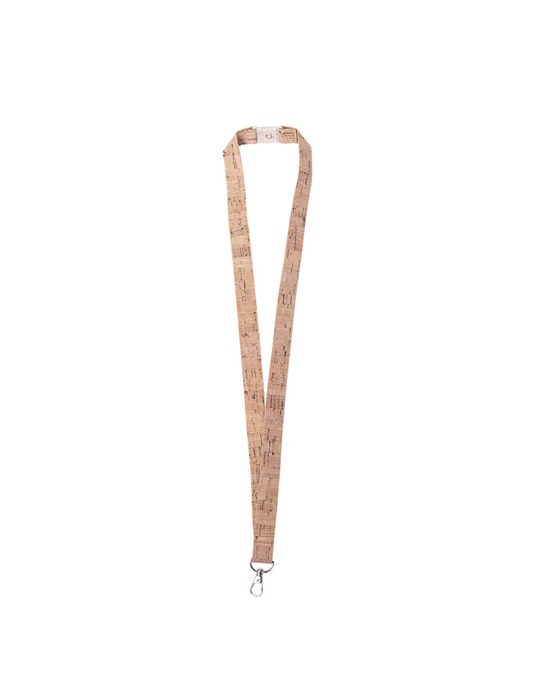 Lanyard de línea nature en corcho natural. Cierre de seguridad en cuello de caña de trigo/PP, para así fomentar la utilización de materias primas naturales y reducir las emisiones contaminantes. Con mosquetón metálico giratorio y disponible en color natural.