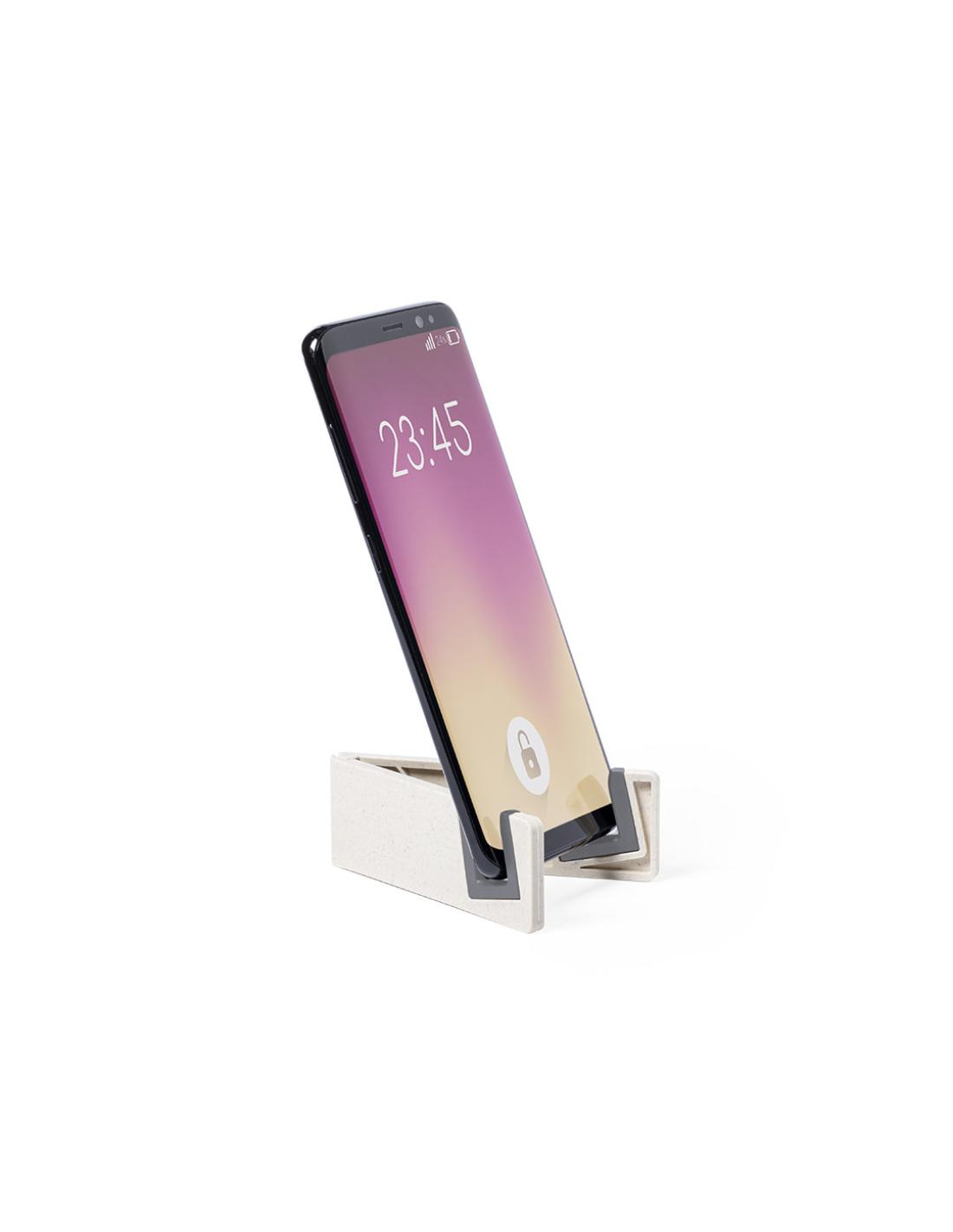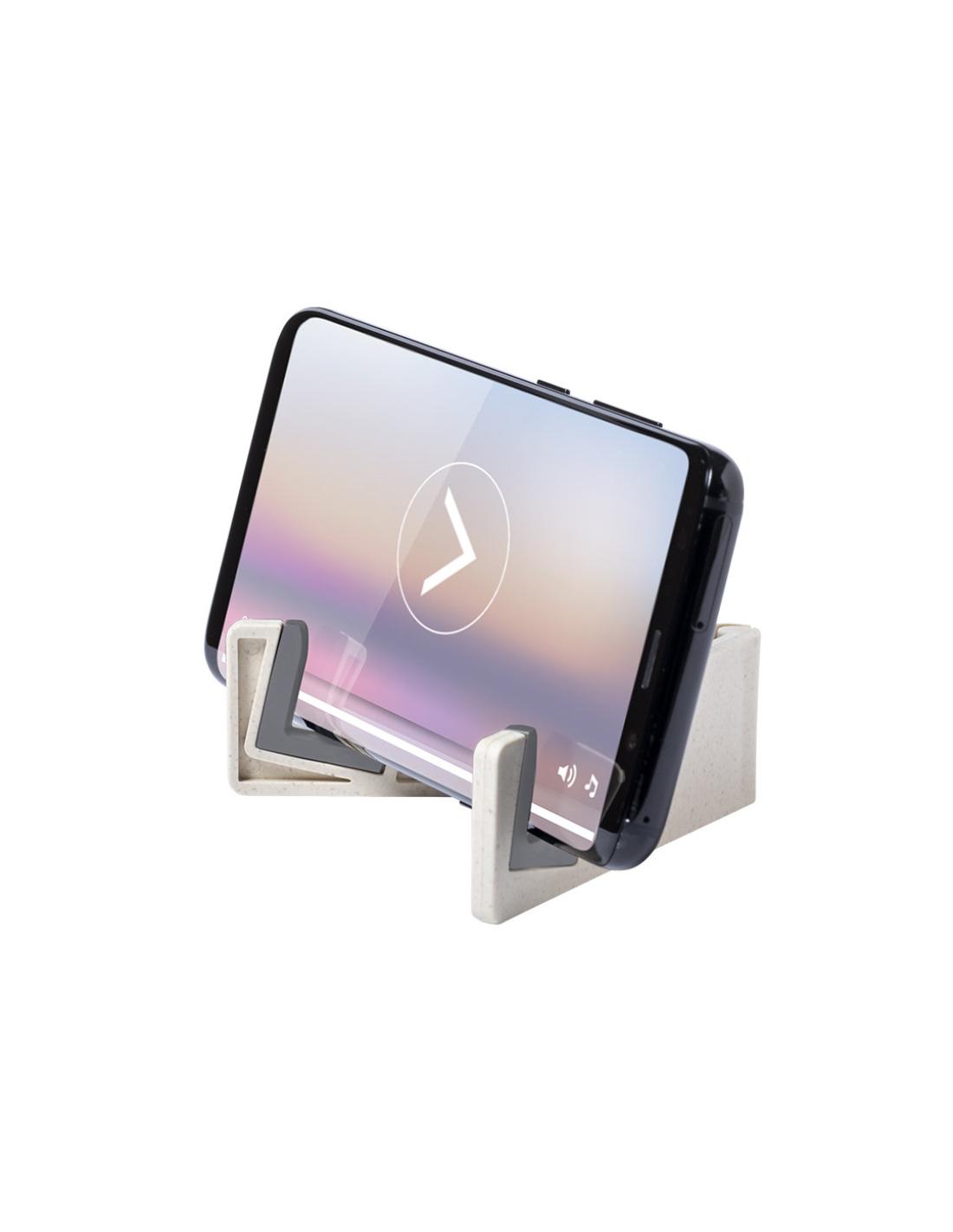 Soporte para dispositivo móvil de línea nature. Fabricado en caña de trigo/PP, para así fomentar la utilización de materias primas naturales y reducir las emisiones contaminantes.Patas plegables con topes antideslizantes en PVC, especialmente diseñado para marcaje en tampografía.