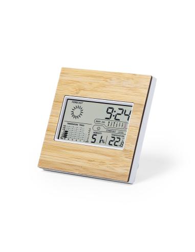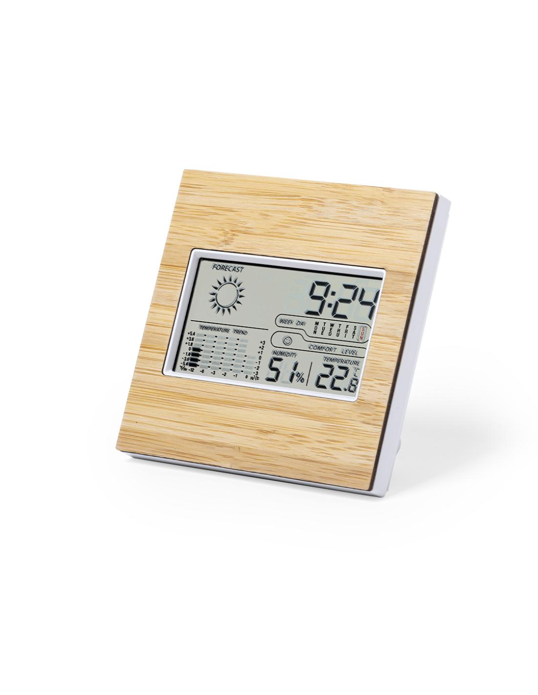 Estación meteorológica de línea nature con frontal en bambú. Con sensor de temperatura y humedad. Función calendario y alarma. Soporte trasero abatible y ajustable, con posibilidad de instalación en la pared. Alimentación a pilas (2xAAA no incluidas) y presentado en atractiva caja de diseño eco. Disponible manual de instrucciones en español e inglés.