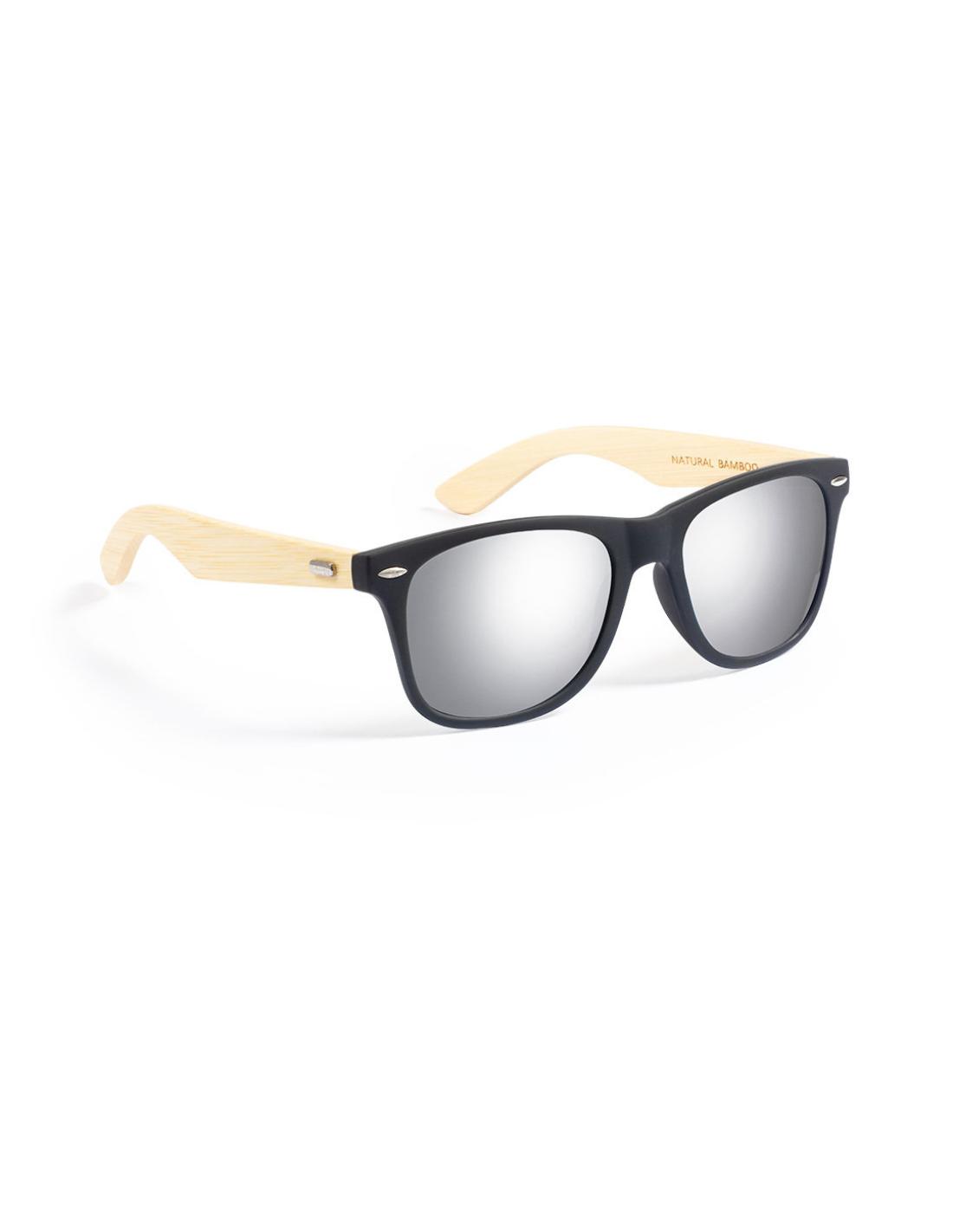 Gafas de sol de línea nature con protección UV400. Montura negra en resistente material PC y patillas en bambú. Lentes AC (acetato de celulosa) de acabado espejo, disponibles en variada gama de colores. Presentada en atractiva caja de diseño eco.