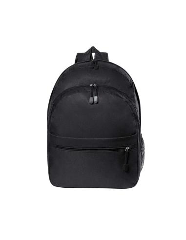Mochila en resistente poliéster 600D de desenfadado diseño en variada gama de colores. Dos compartimentos principales con cierre de cremallera y bolsillo en frontal. Redecilla lateral de fácil acceso, tiradores con cinta para fácil apertura y accesorios en color negro. Espalda acolchada y cintas de hombros ajustables con acolchado.