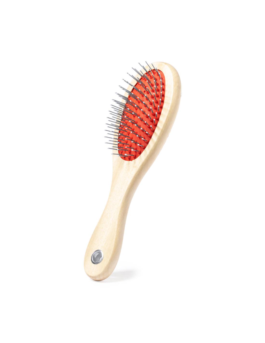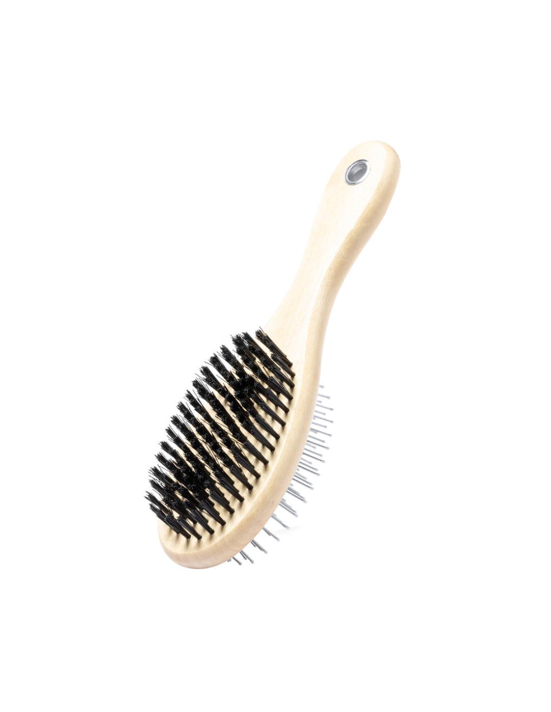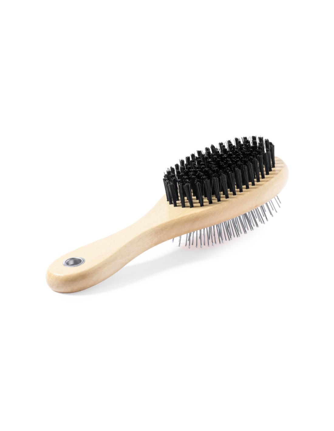 Cepillo para mascotas con cuerpo en resistente madera natural. Con dos tipos de cepillo diferentes, uno en cada lado.
