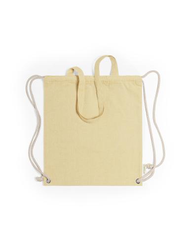 Bolsa mochila de cuerdas de línea nature, en resistente algodón reciclado de 140g/m2, con asas de transporte de 70 cm a juego. Cuerdas en algodón de color crudo, con argollas metálicas reforzadas y distintivo algodón reciclado en etiqueta. Disponible en variada gama de colores. Resistencia hasta 9kg de peso.