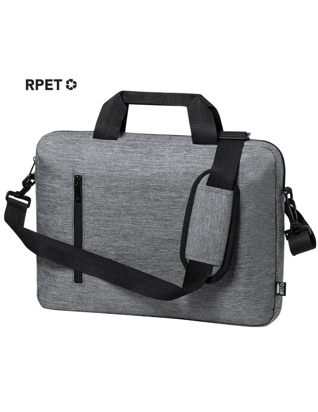 Elegante portadocumentos de línea nature en resistente 600D RPET efecto melange, elaborado a partir de plástico reciclado para así fomentar la reutilización de residuos plásticos y contribuir a la sostenibilidad del planeta. Detalles en negro, incluye compartimentos interiores acolchados para ordenador de hasta 15 pulgadas y tablet de hasta 10 pulgadas. Accesorio en parte posterior para anclaje al trolley, bolsillo exterior con cierre de cremallera, cómodas asas reforzadas, cinta bandolera ajustable con cierre de mosquetón y almohadilla para hombro a juego. Distintivo RPET en etiqueta exterior.