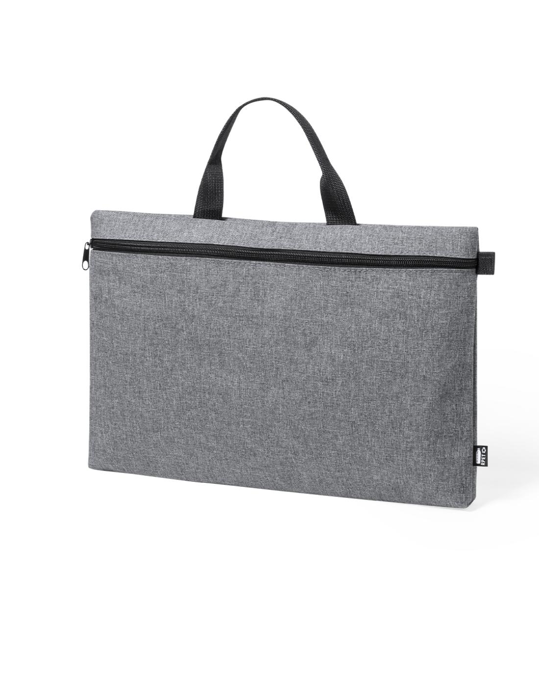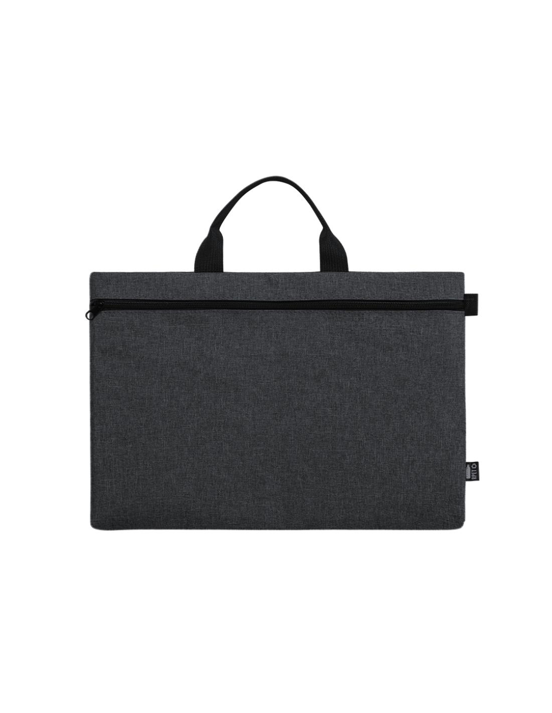 Portadocumentos de línea nature y en resistente 600D RPET efecto melange, elaborado a partir de plástico reciclado para así fomentar la reutilización de residuos plásticos y contribuir a la sostenibilidad del planeta. Detalles en negro y compartimento principal con cierre de cremallera. Resistentes asas a juego y distintivo RPET en etiqueta exterior.