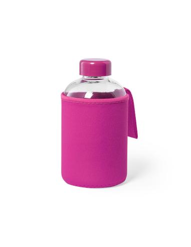 Bidón de 600ml de capacidad. Fabricado con cuerpo de cristal y tapón a rosca. Incluye funda de soft shell a juego, con asa de transporte. Disponible en variada gama de colores, y viene presentado en caja individual de atractivo diseño.