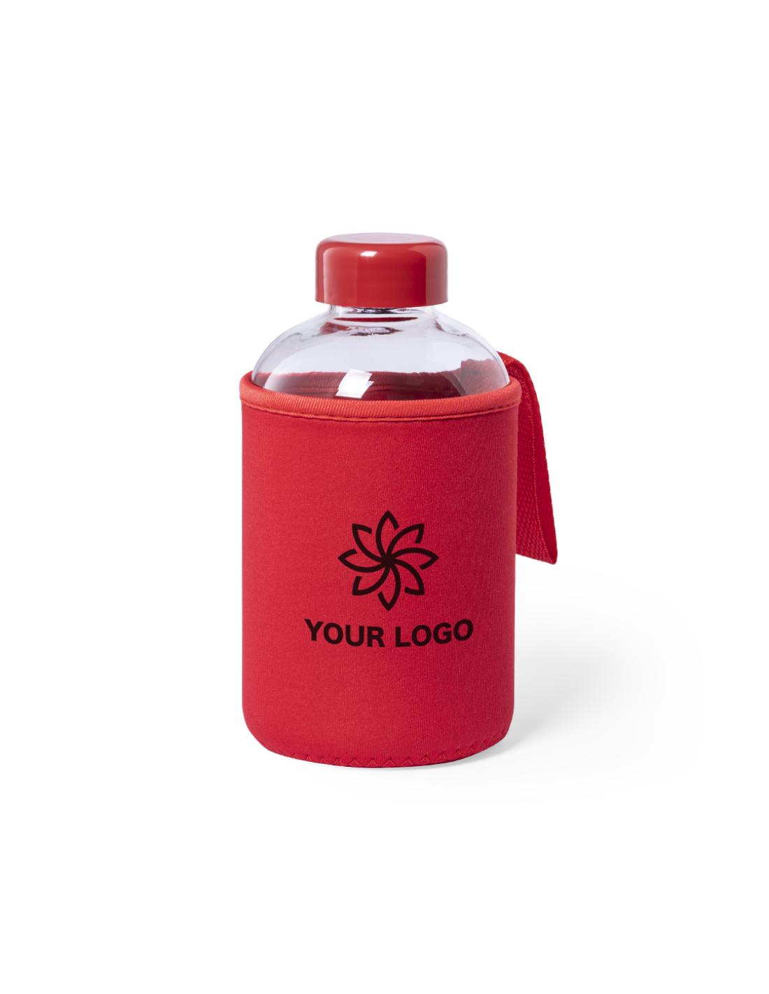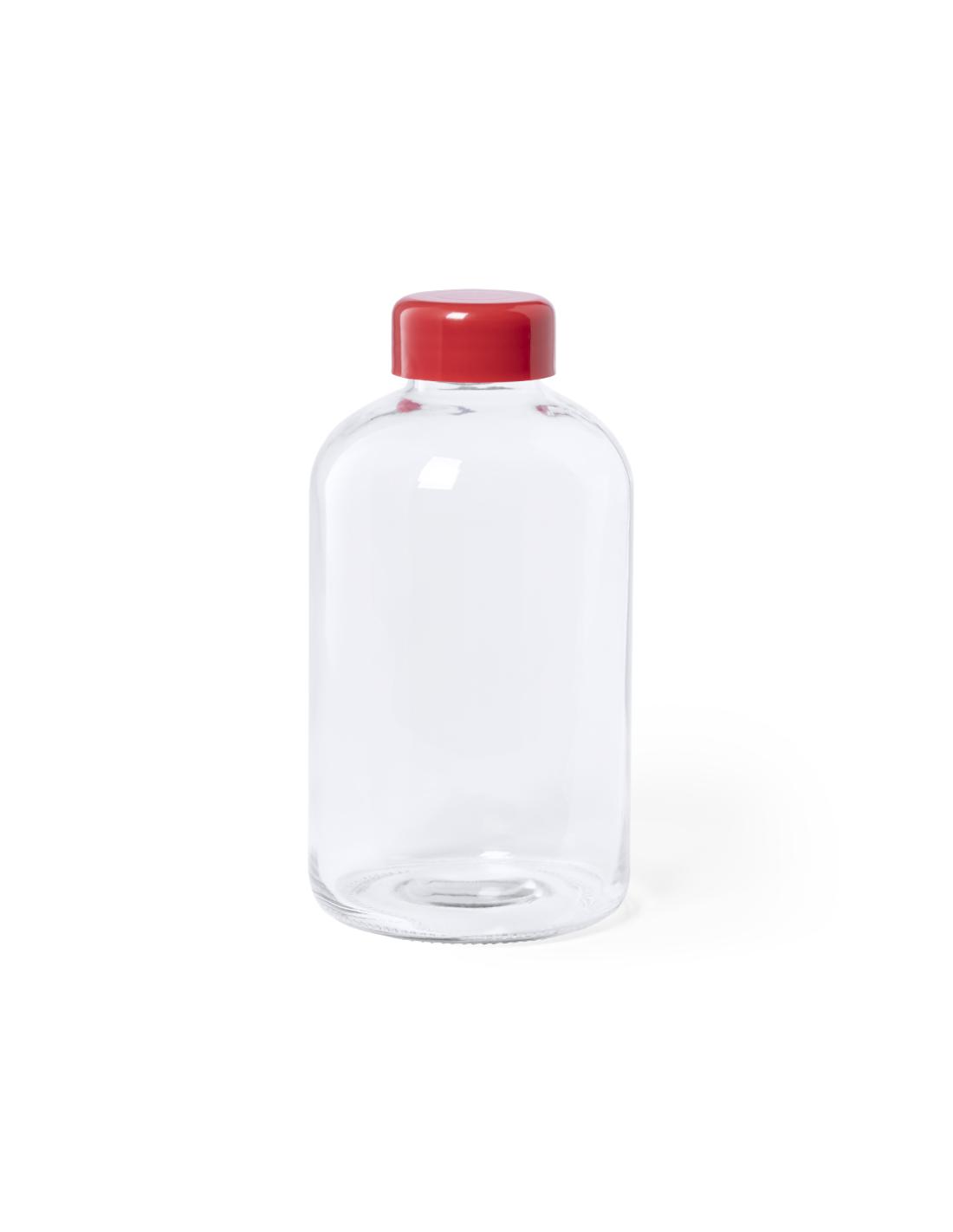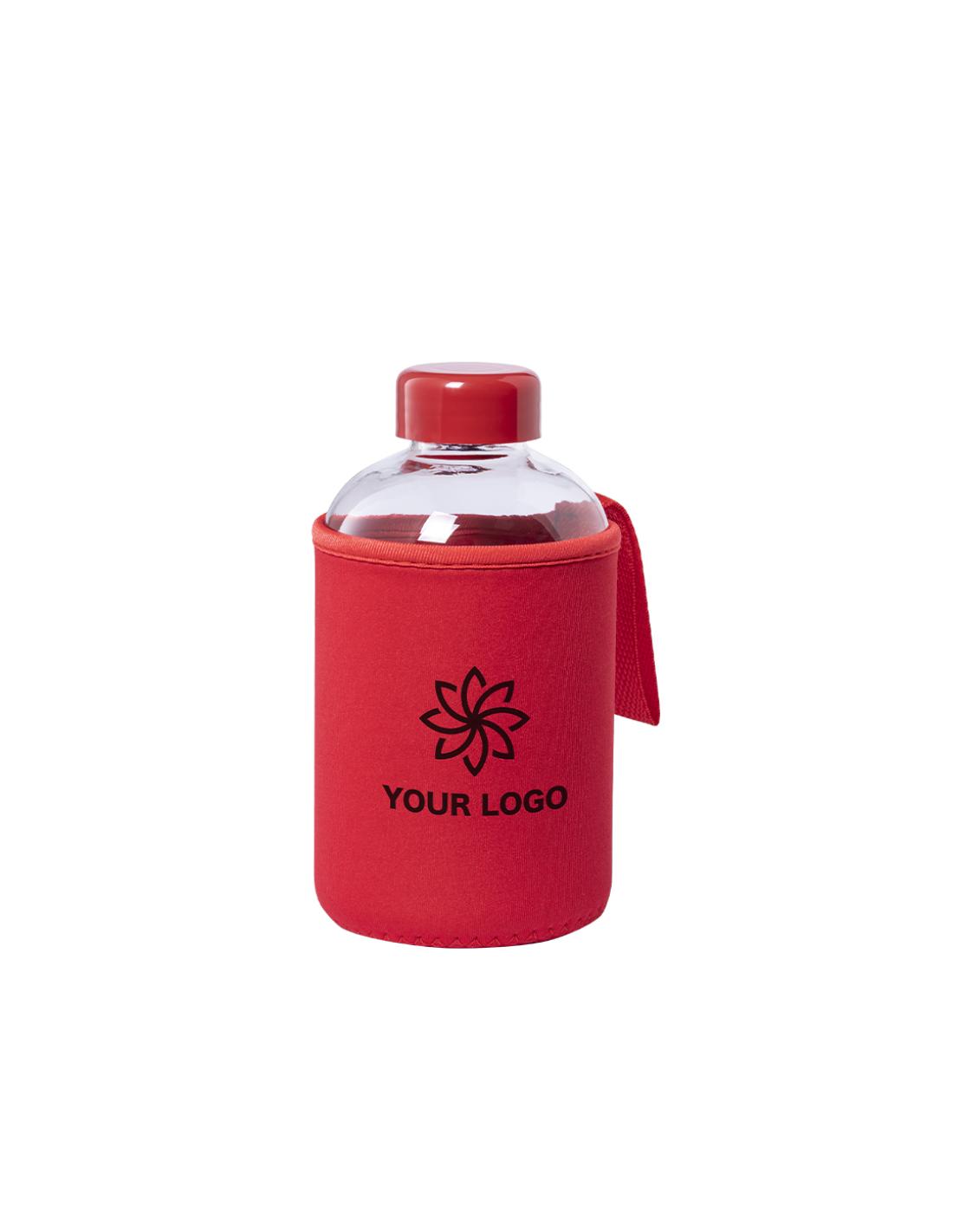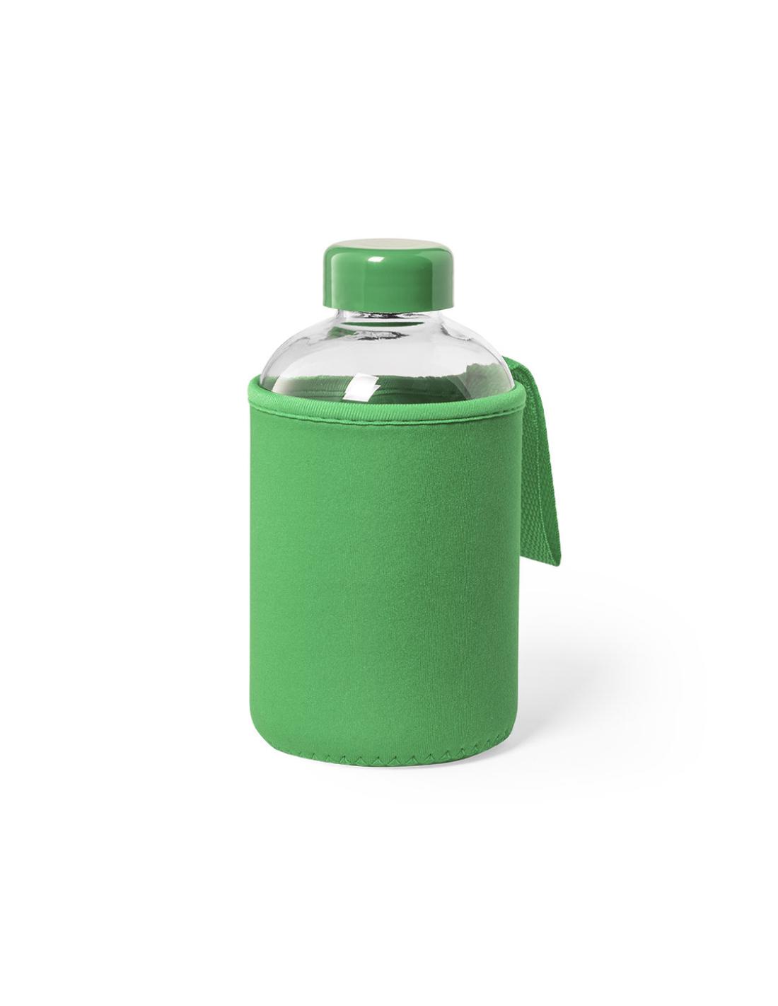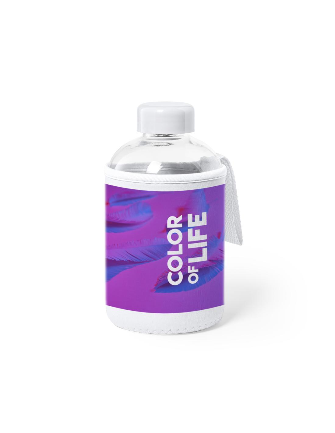Bidón de 600ml de capacidad. Fabricado con cuerpo de cristal y tapón a rosca. Incluye funda de soft shell a juego, con asa de transporte. Disponible en variada gama de colores, y viene presentado en caja individual de atractivo diseño.