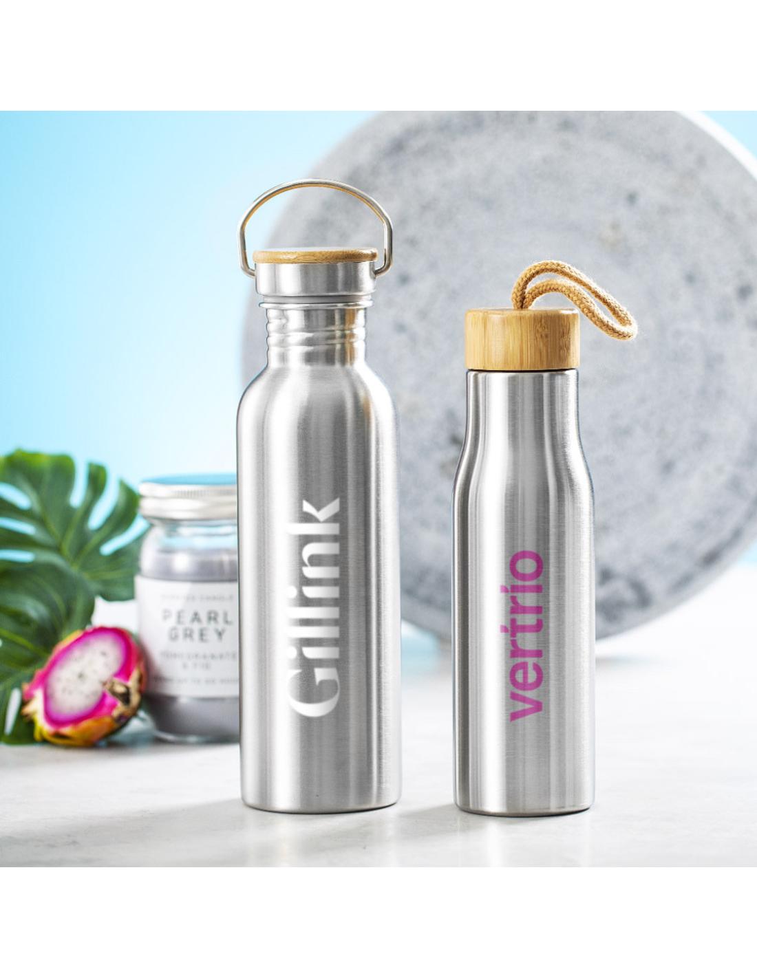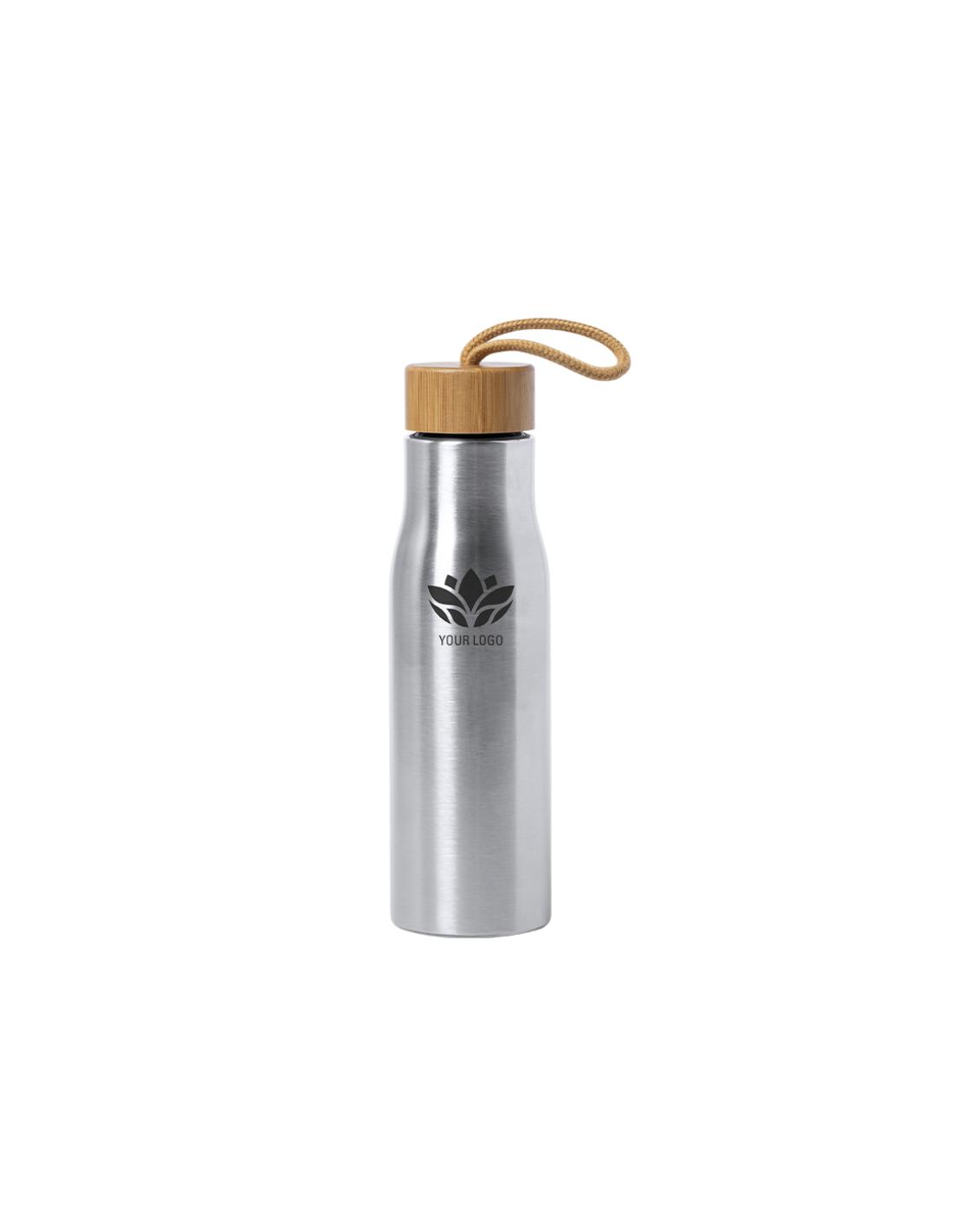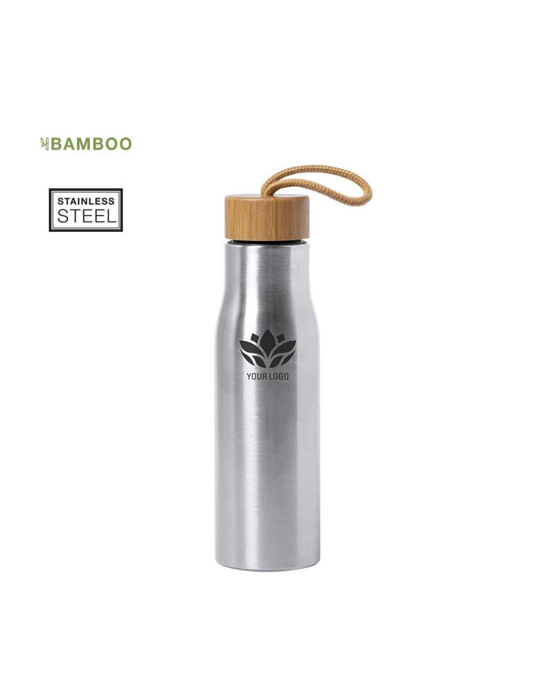 Bidón de línea nature y 600ml de capacidad. Cuerpo fabricado en acero inox y tapón en bambú con cinta de transporte. Libre de BPA y presentado en atractiva caja de diseño eco.