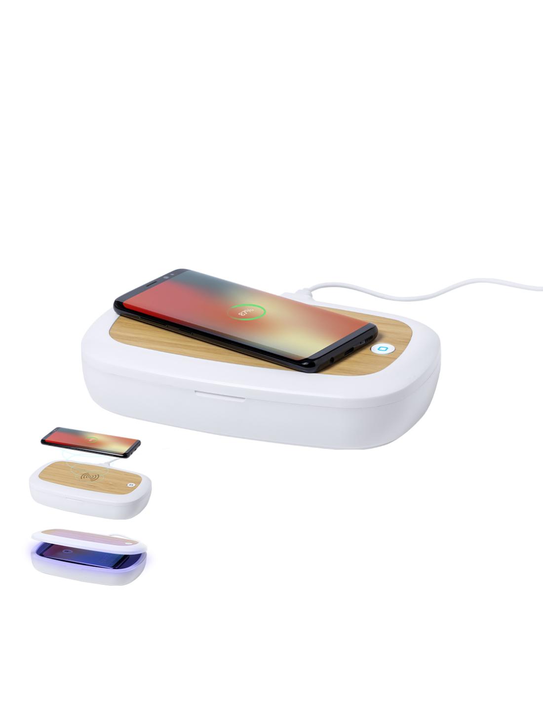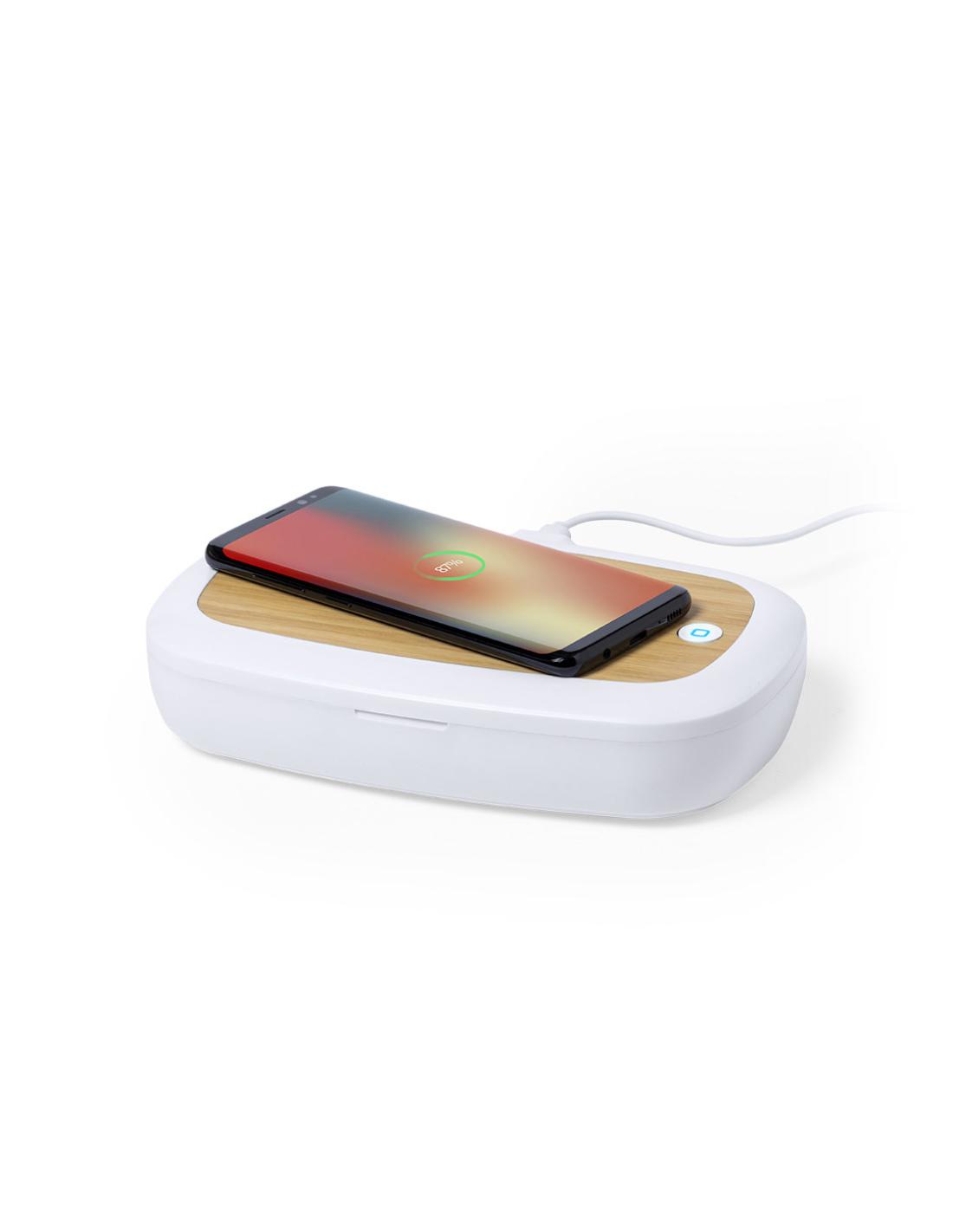 Caja esterilizadora de línea nature, con base de carga en bambú. Luz ultravioleta tipo C, con cargador inalámbrico 5W para smartphone integrado en tapa. Especialmente diseñada para la eliminación de microorganismos y bacterias en objetos de uso cotidiano como el smartphone, llaves, gafas, mascarilla, auriculares, smartwatch... Fabricada en resistente material ABS de acabado mate y presentada en atractiva caja individual de diseño. Fácil de usar, basta con introducir el objeto dentro de la caja. Potencia de bombilla 1W longitud de onda de 270-280 nm, con alimentación mediante cable USB Tipo C de 1m de largo con color a juego. Tiempo de esterilización de 5 y 10 minutos con función auto-apagado. Disponible manual de usuario en español e inglés. Disponible certificación CE, RoHS y de efectividad germicida.