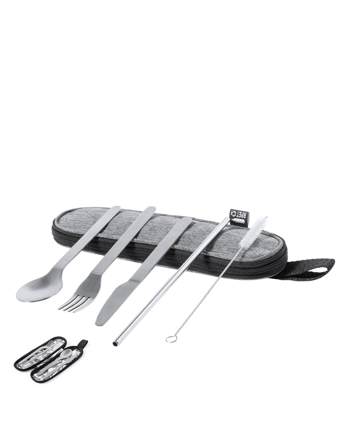 Set de cubiertos reutilizables fabricados en resistente y duradero acero inox. Incluye cuchara, cuchillo, tenedor, pajita y accesorio de limpieza. Presentados en elegante estuche individual de poliéster 300D RPET, elaborado a partir de plástico reciclado para así fomentar la reutilización de residuos plásticos y ayudar a la sostenibilidad del planeta. Estuche con cinta de transporte, cierre de cremallera y distintivo RPET en etiqueta.