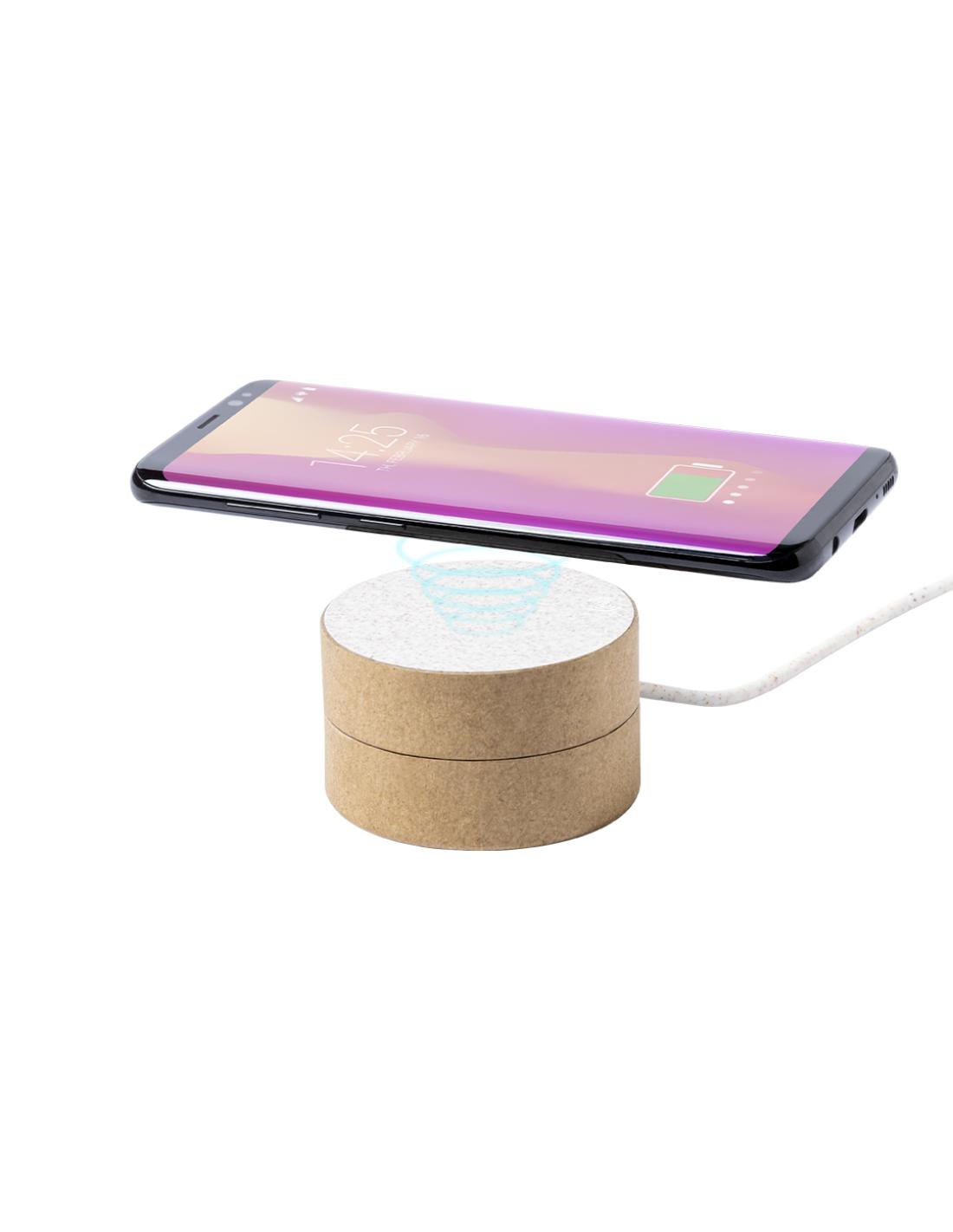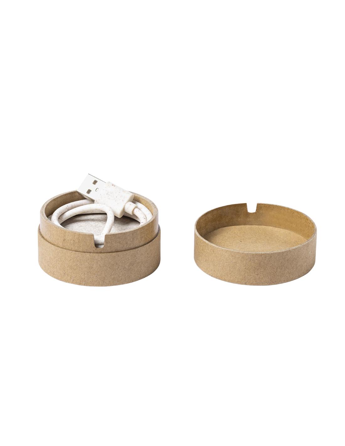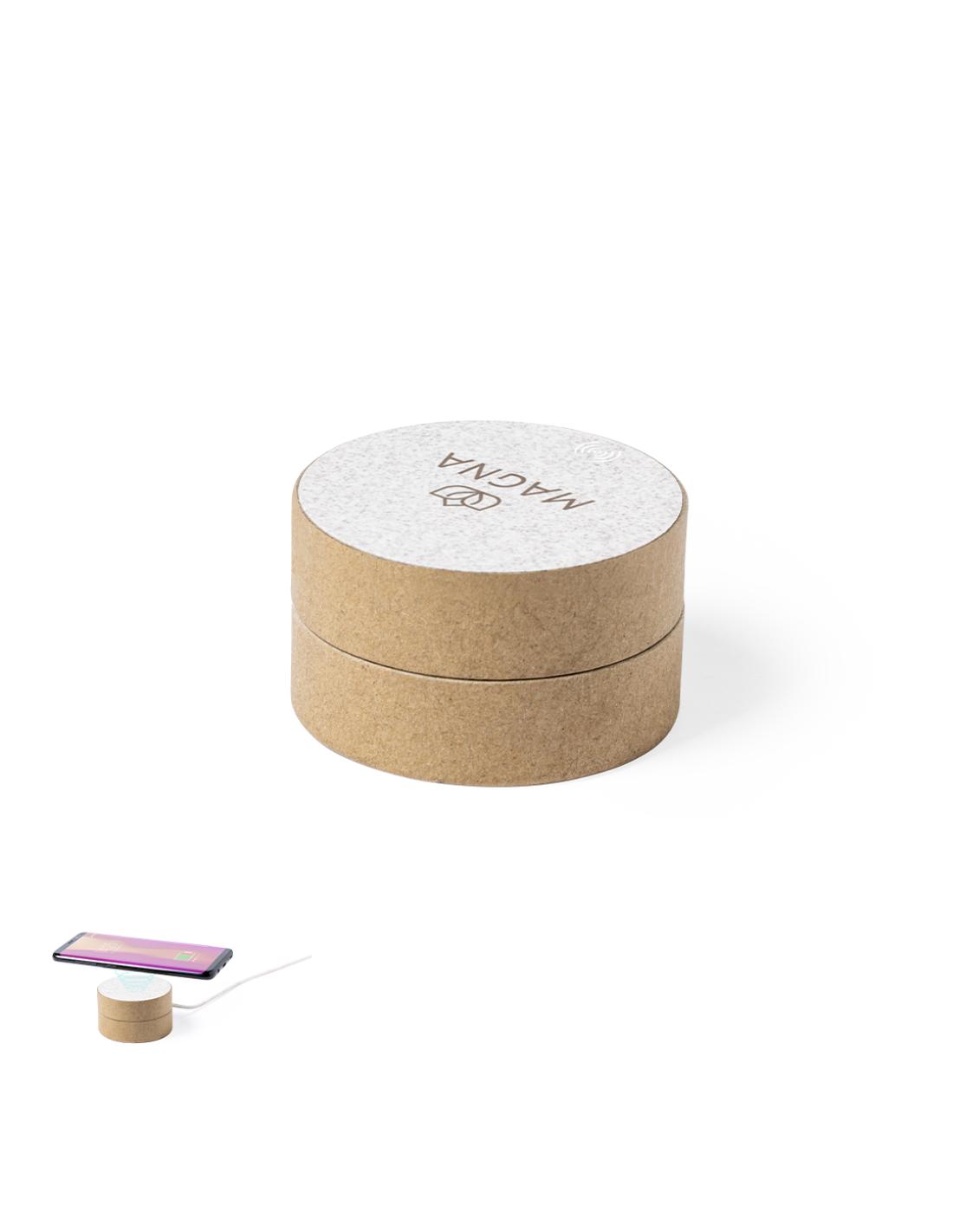 Original cargador inalámbrico circular de línea nature. Carcasa en cartón reciclado, contribuyendo a la conservación de los bosques y reduciendo considerablemente la huella de carbono, con superficie de carga y cable en caña de trigo. Compartimento interior para guardar el cable y poder llevarlo a cualquier lado. Indicador LED de estado de carga, compatible con smartphones con tecnología de carga inalámbrica y presentado en atractiva caja de diseño eco, con manual de instrucciones en español e inglés.