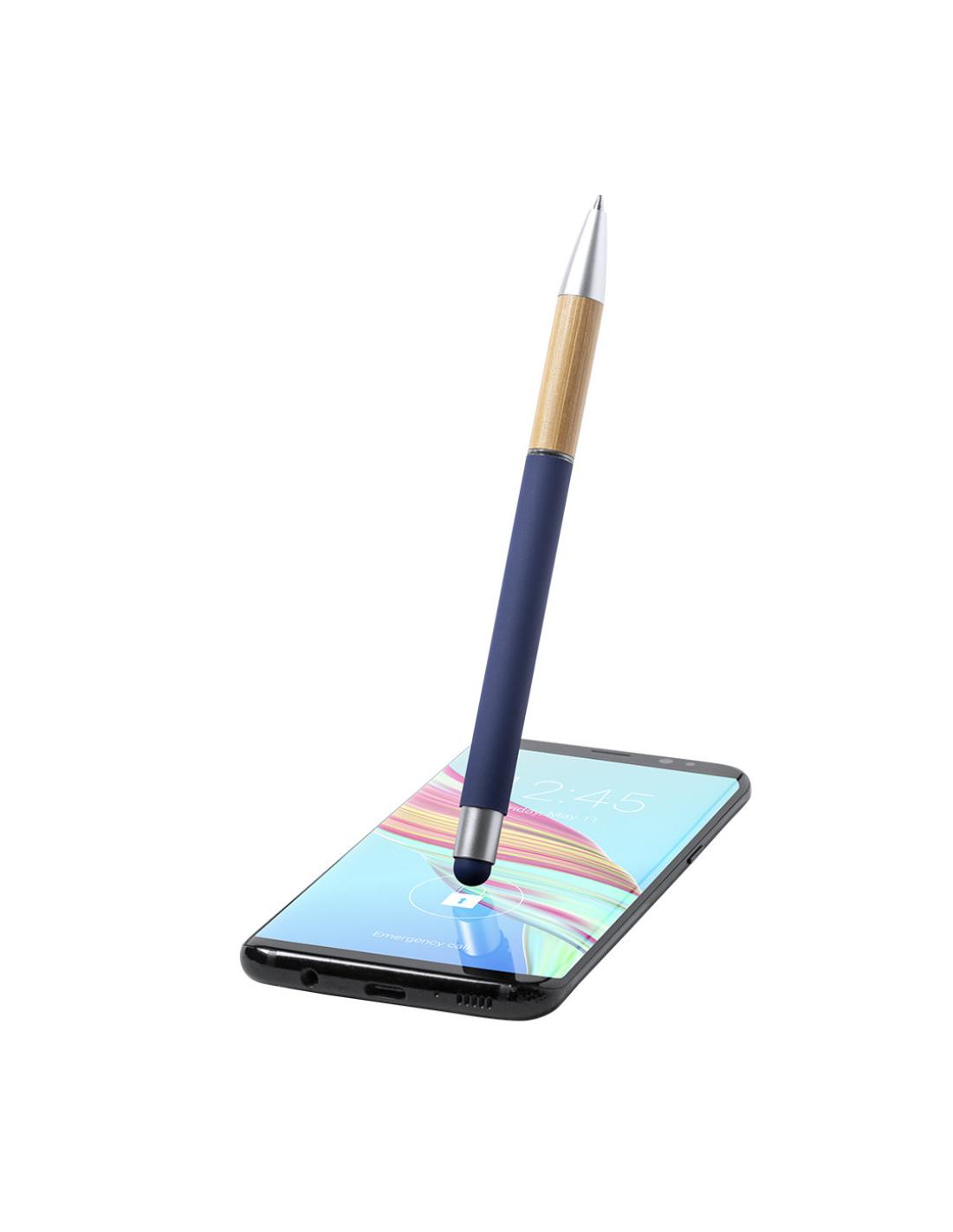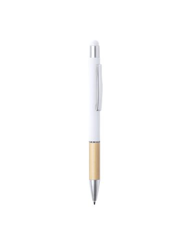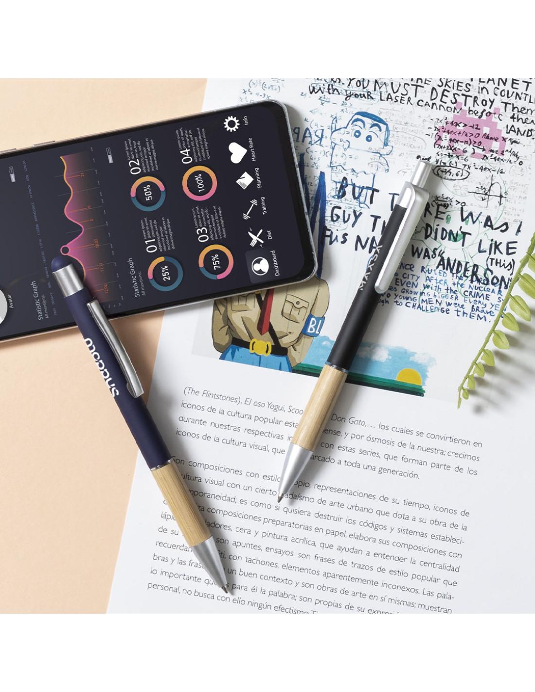 Bolígrafo puntero de línea nature y mecanismo pulsador. De elegante diseño, con cuerpo en aluminio de acabado mate y empuñadura en bambú, con accesorios en acabado mate. Clip metálico y anilla transparente, en tinta azul. Disponible en variada gama de colores.