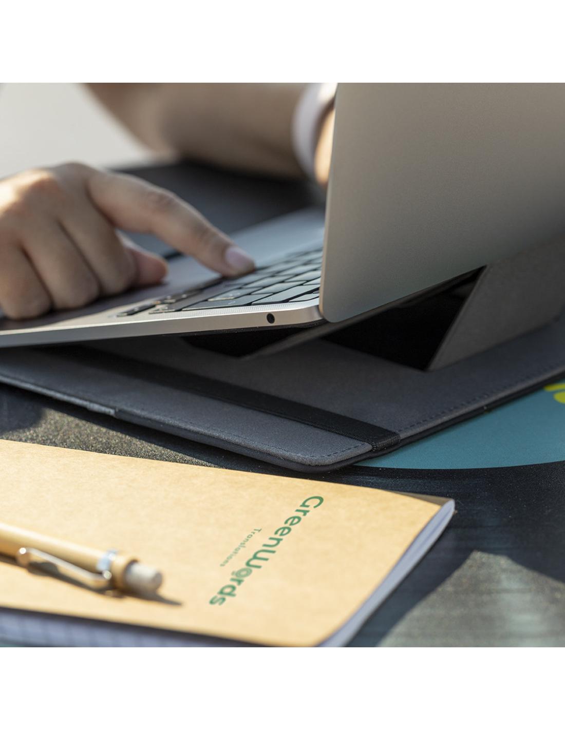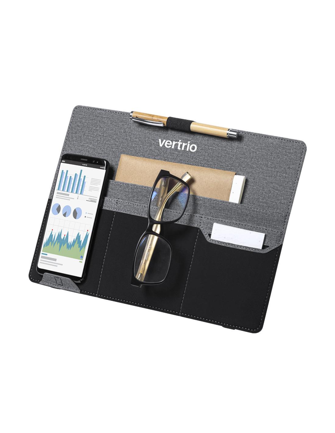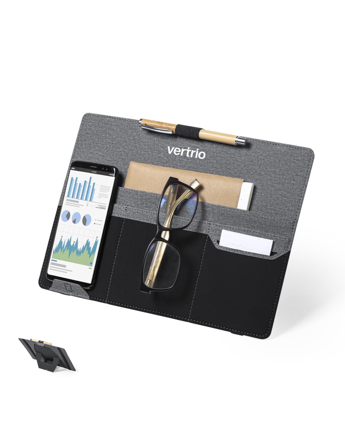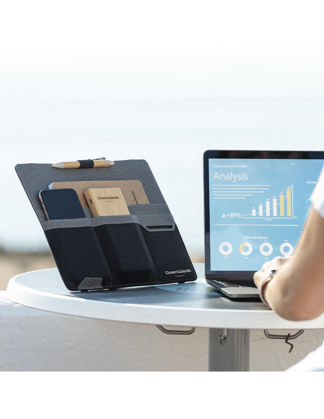 Elegante y práctico organizador con soporte imantado, ideal para facilitar el trabajo o uso de portátil en cualquier lugar o espacio. Fabricado en resistente poliéster gris jaspeado con detalles en polipiel de color negro. Incluye soporte para bolígrafo y smartphone, con 4 bolsillos elásticos para el almacenamiento de diferentes gadgets.