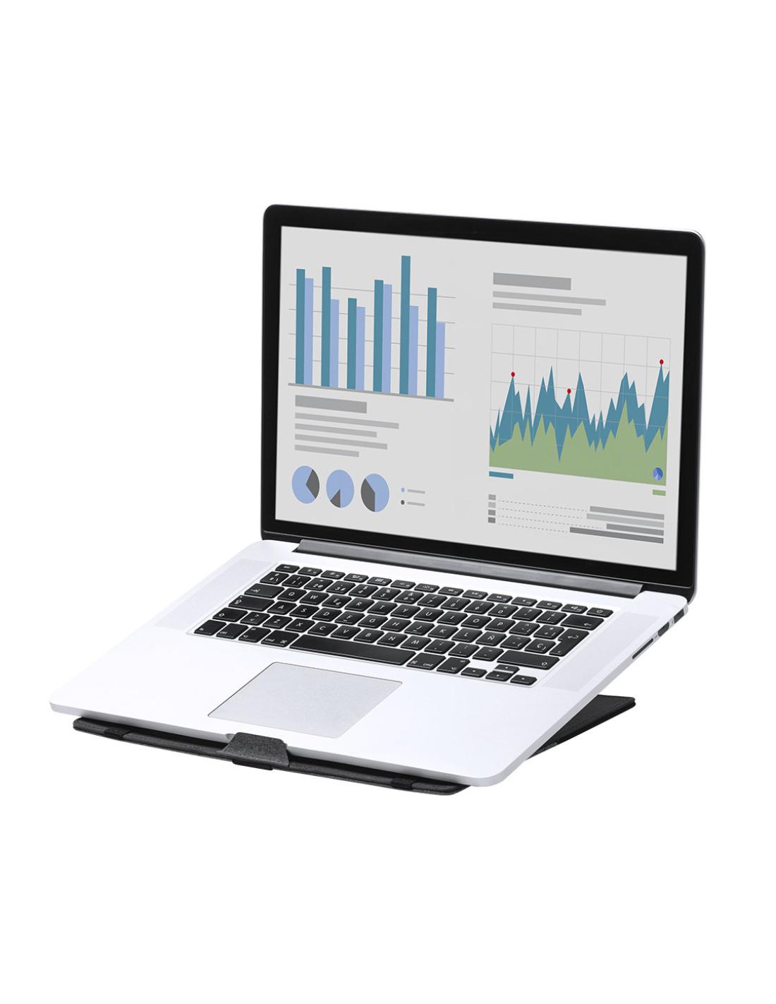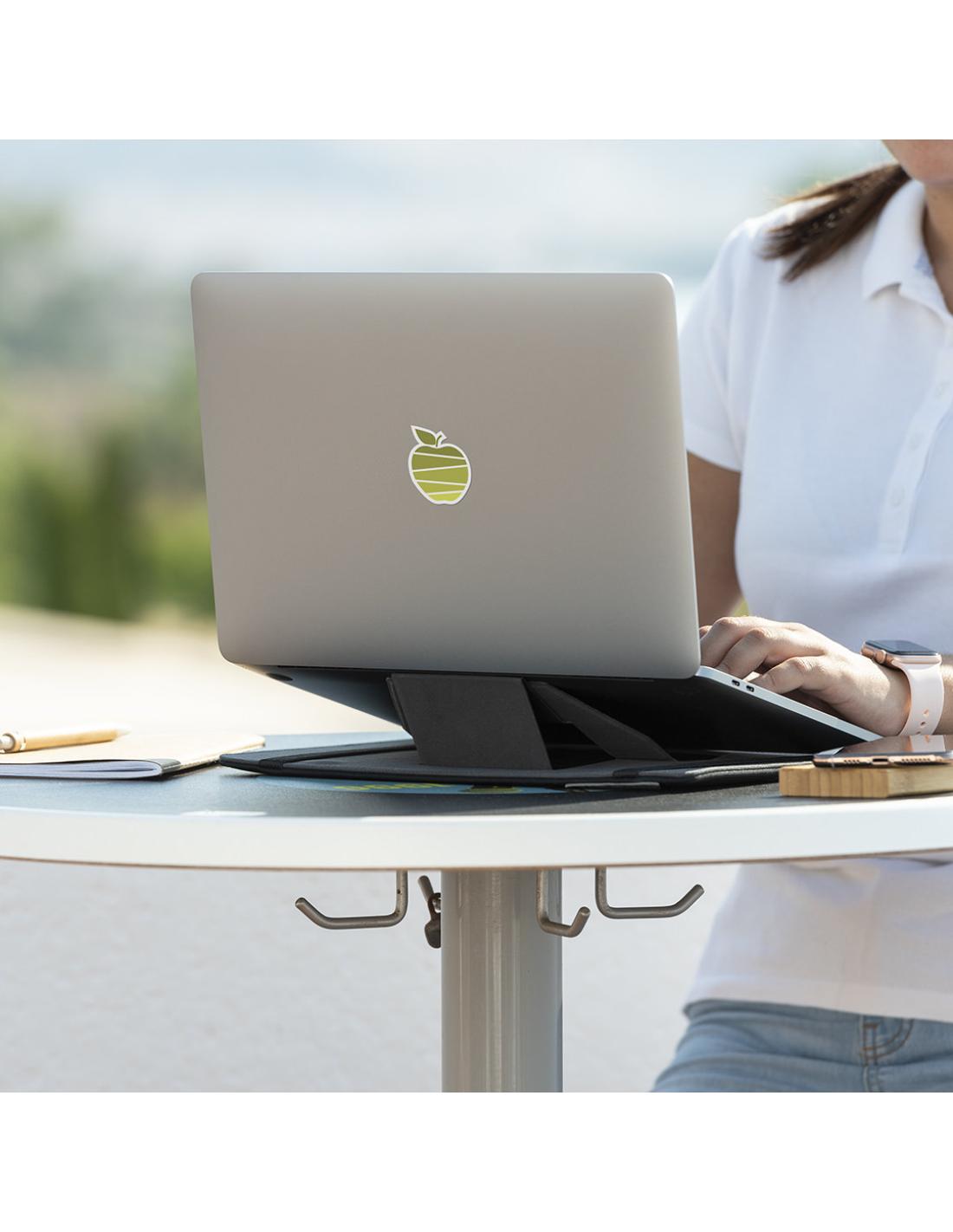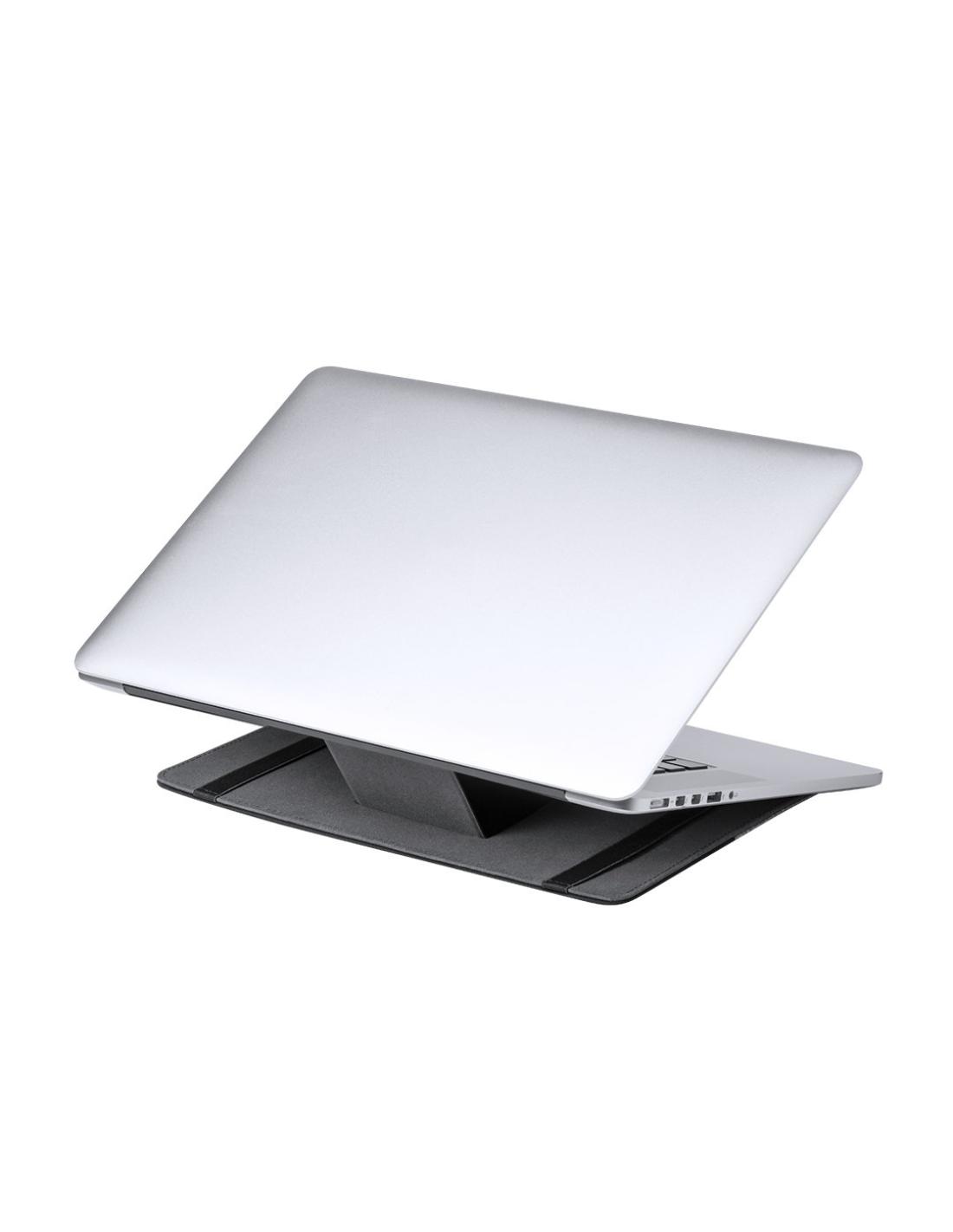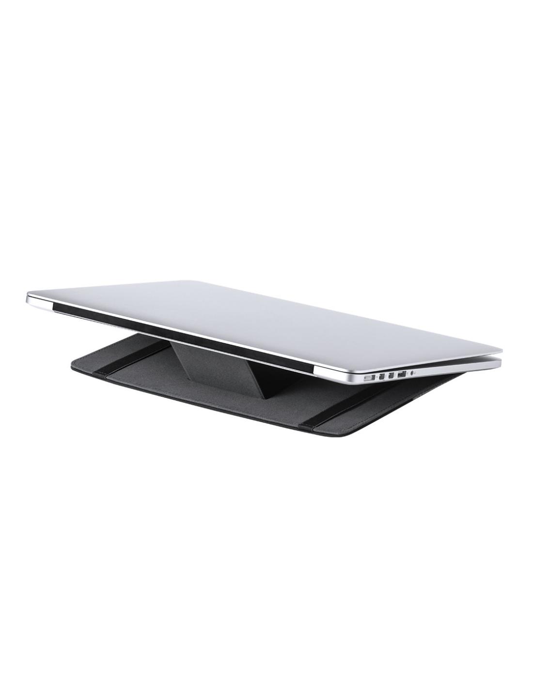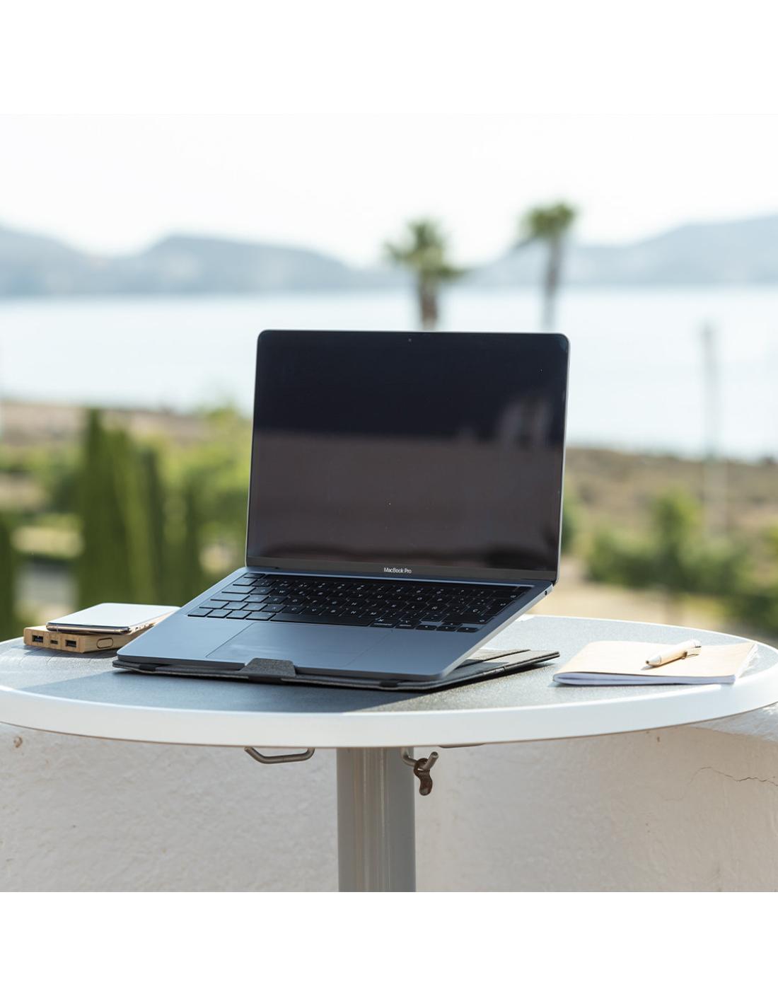Elegante y práctico organizador con soporte imantado, ideal para facilitar el trabajo o uso de portátil en cualquier lugar o espacio. Fabricado en resistente poliéster gris jaspeado con detalles en polipiel de color negro. Incluye soporte para bolígrafo y smartphone, con 4 bolsillos elásticos para el almacenamiento de diferentes gadgets.