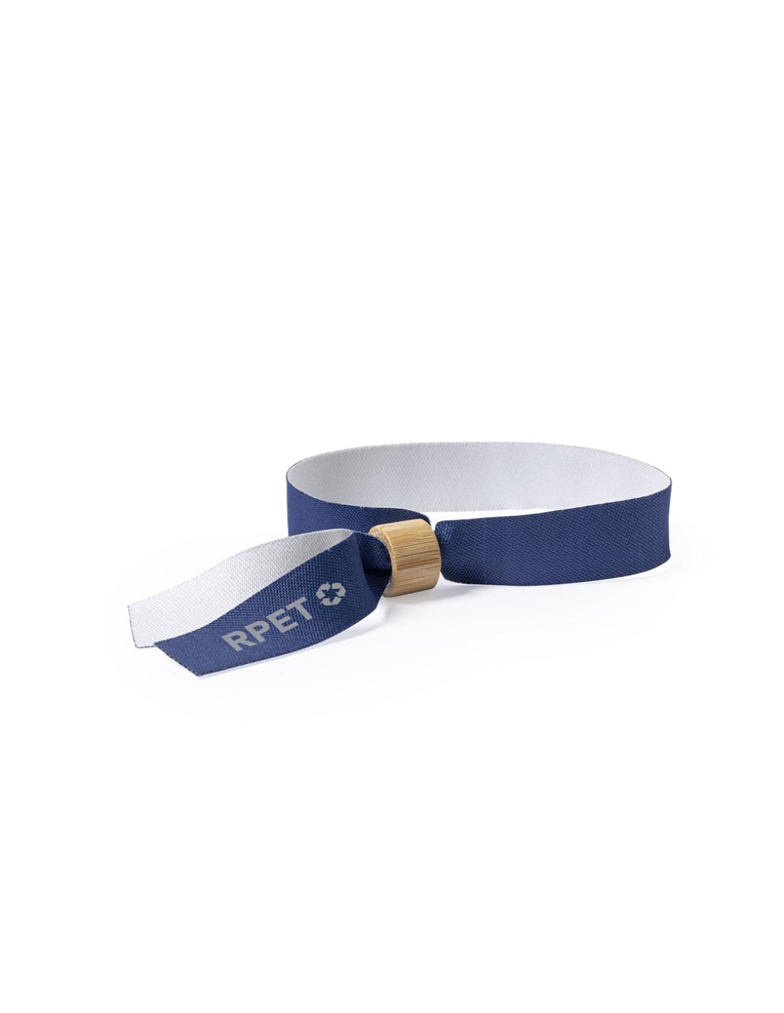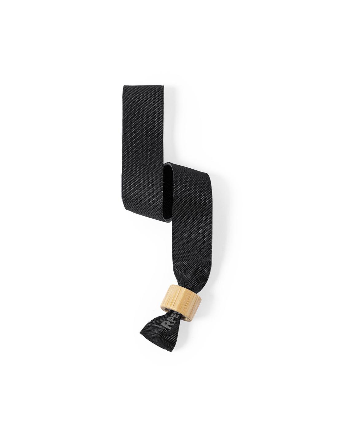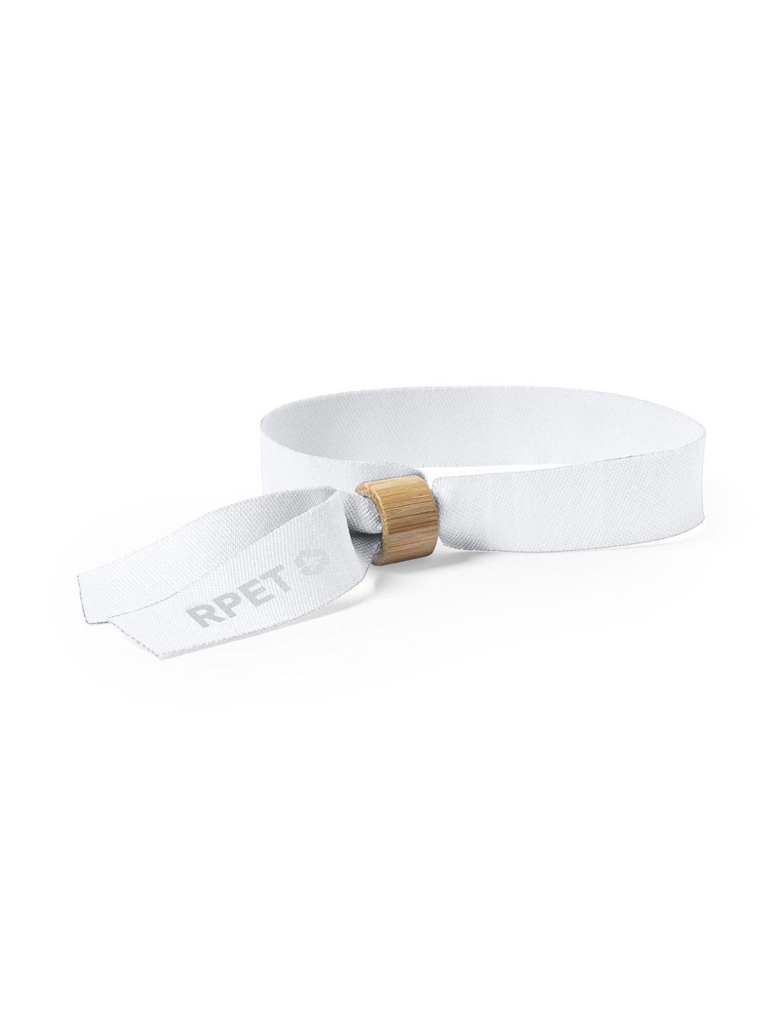 Pulsera para eventos de línea nature. Fabricada en poliéster RPET de 160g/m2, elaborado a partir de plástico reciclado para así fomentar la reutilización de residuos plásticos y contribuir a la sostenibilidad del planeta. Con ajustador en bambú y disponible en variada gama de colores, color blanco especialmente diseñado para sublimación. Distintivo RPET impreso en la pulsera.