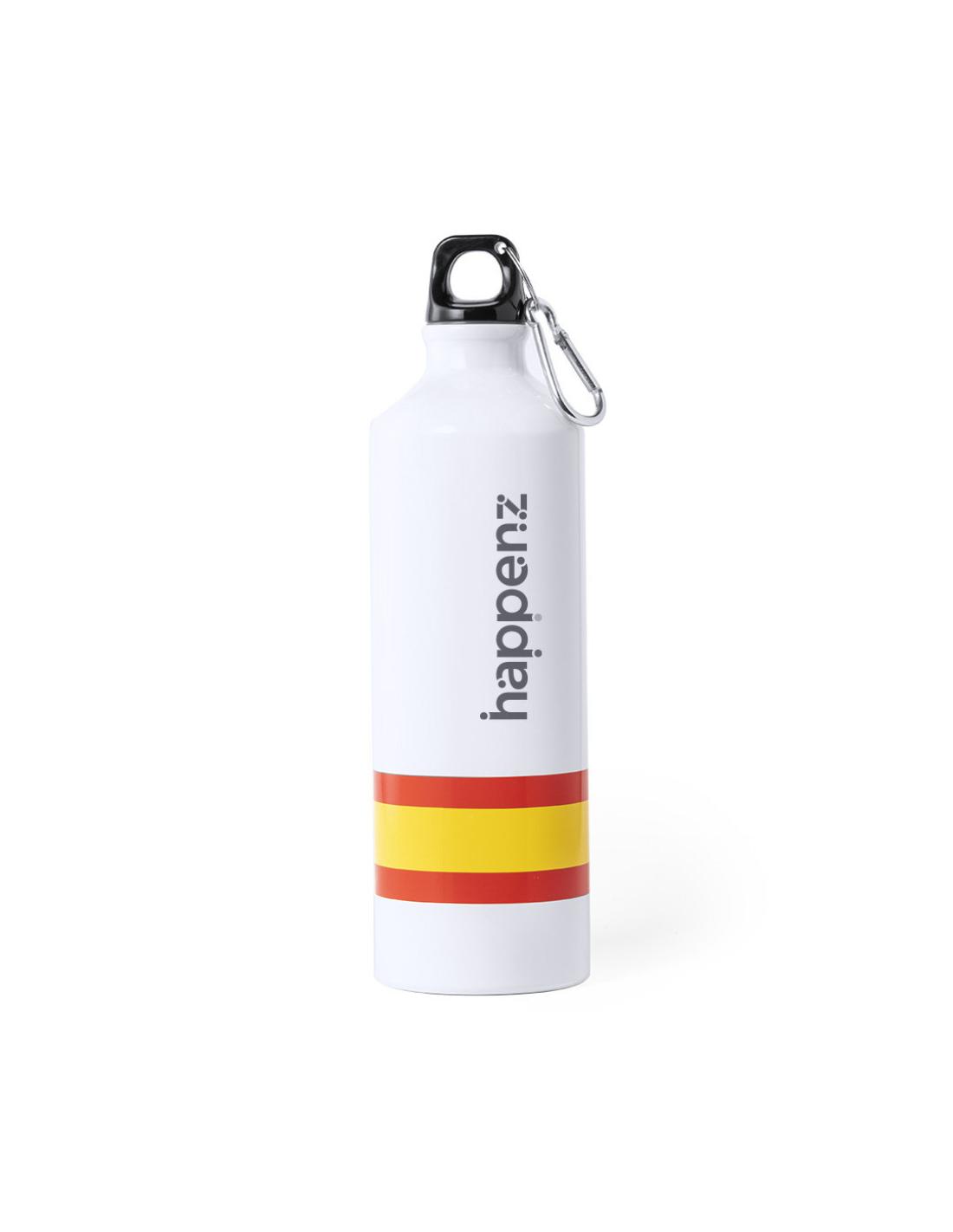 Bidón con diseño España y cuerpo en blanco. De 800 ml de capacidad y acabado en aluminio, con tapón de seguridad a rosca libre de BPA, y mosquetón de transporte. Presentado en atractiva caja de diseño.