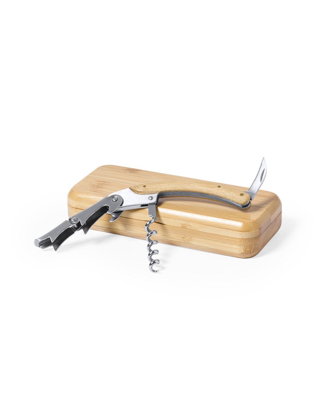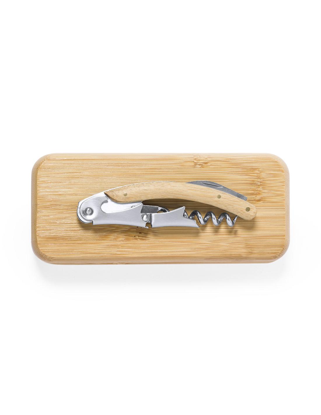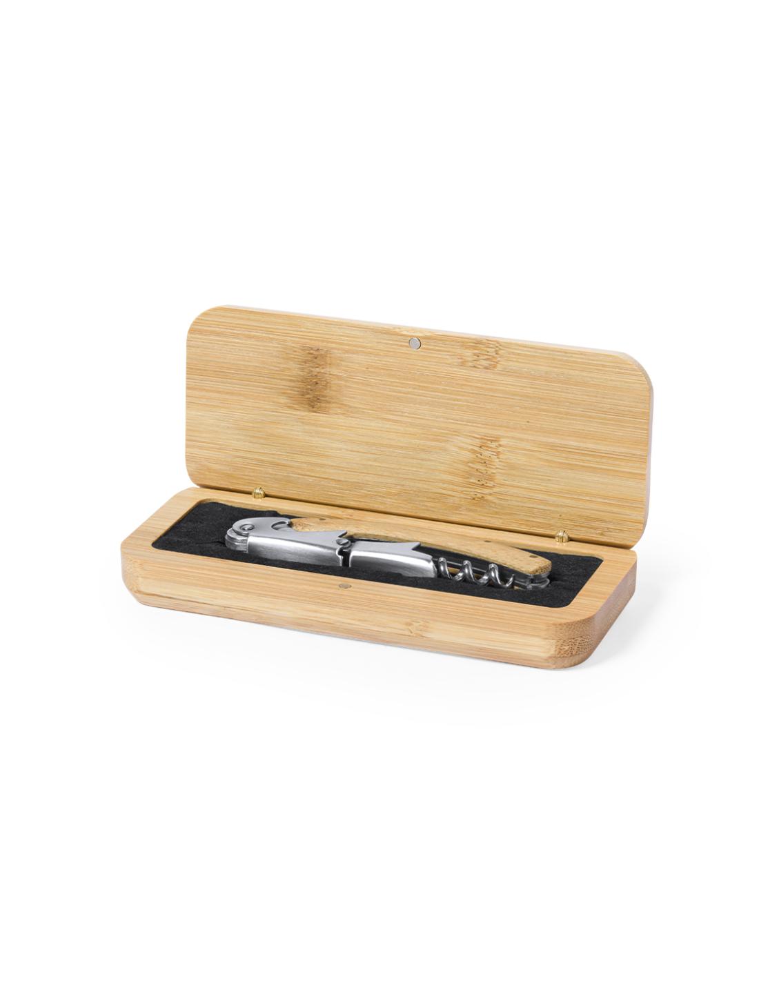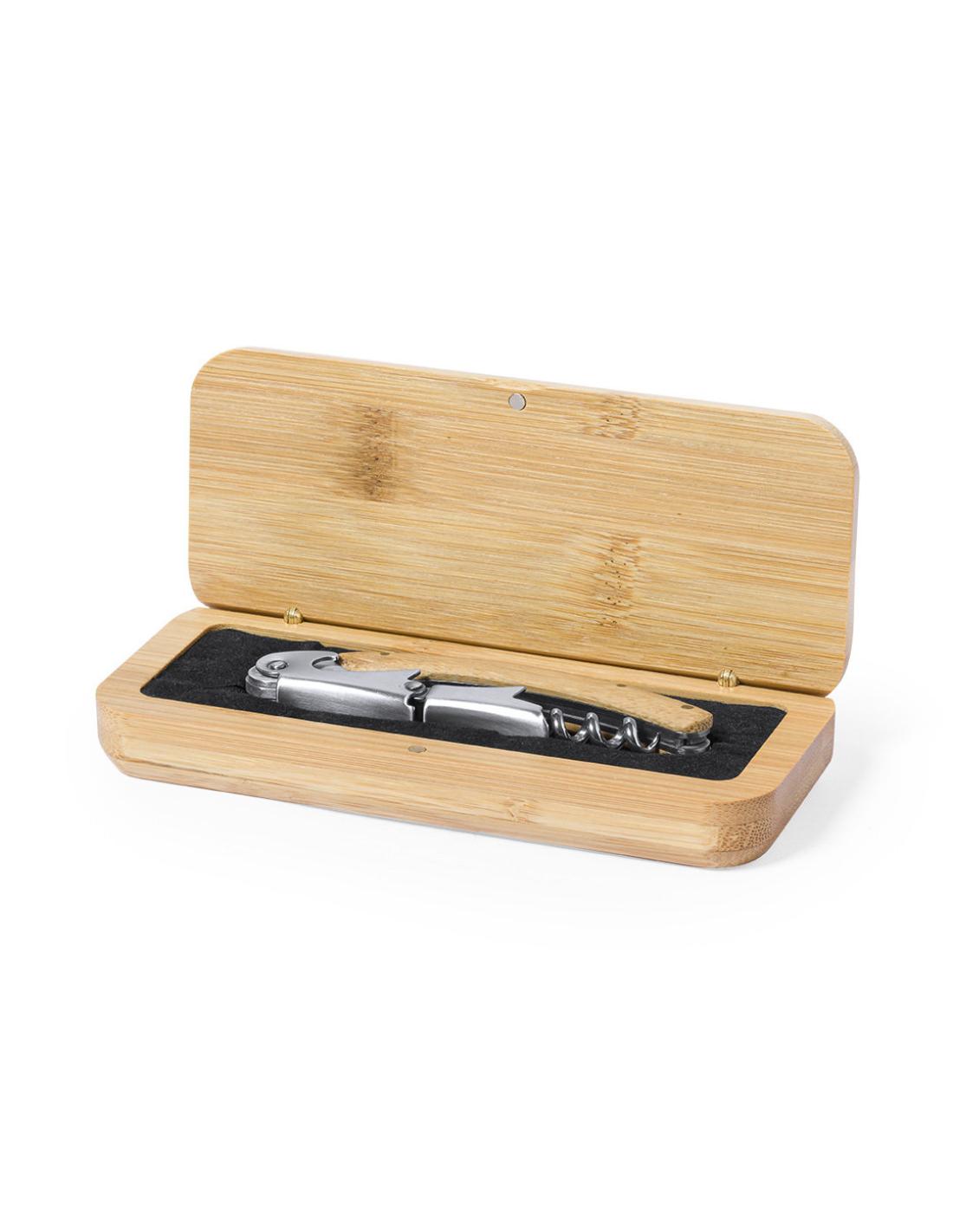 Sacacorchos de línea nature con abridor de botellas y cortacápsulas. Fabricado en combinación de de bambú y metal, combinando materiales naturales con materiales duraderos. Presentado en estuche individual de bambú pulido, con interior en EVA troquelada y en atractiva caja individual de diseño eco.