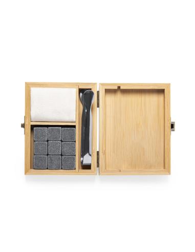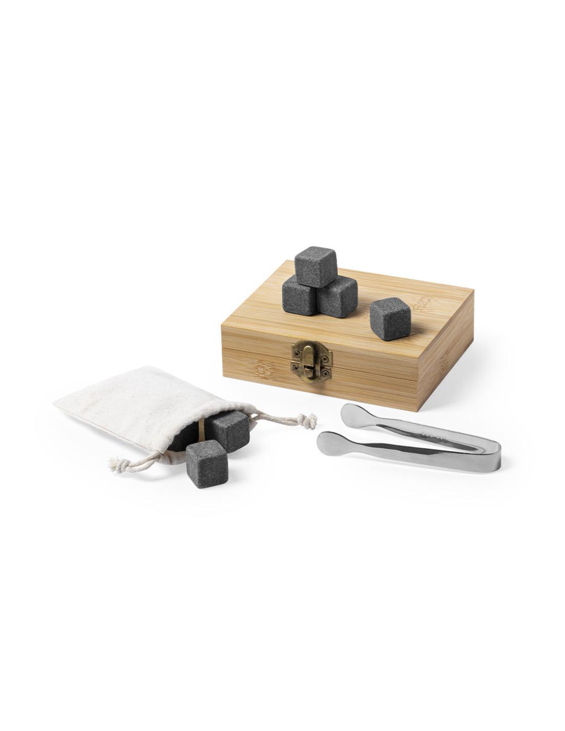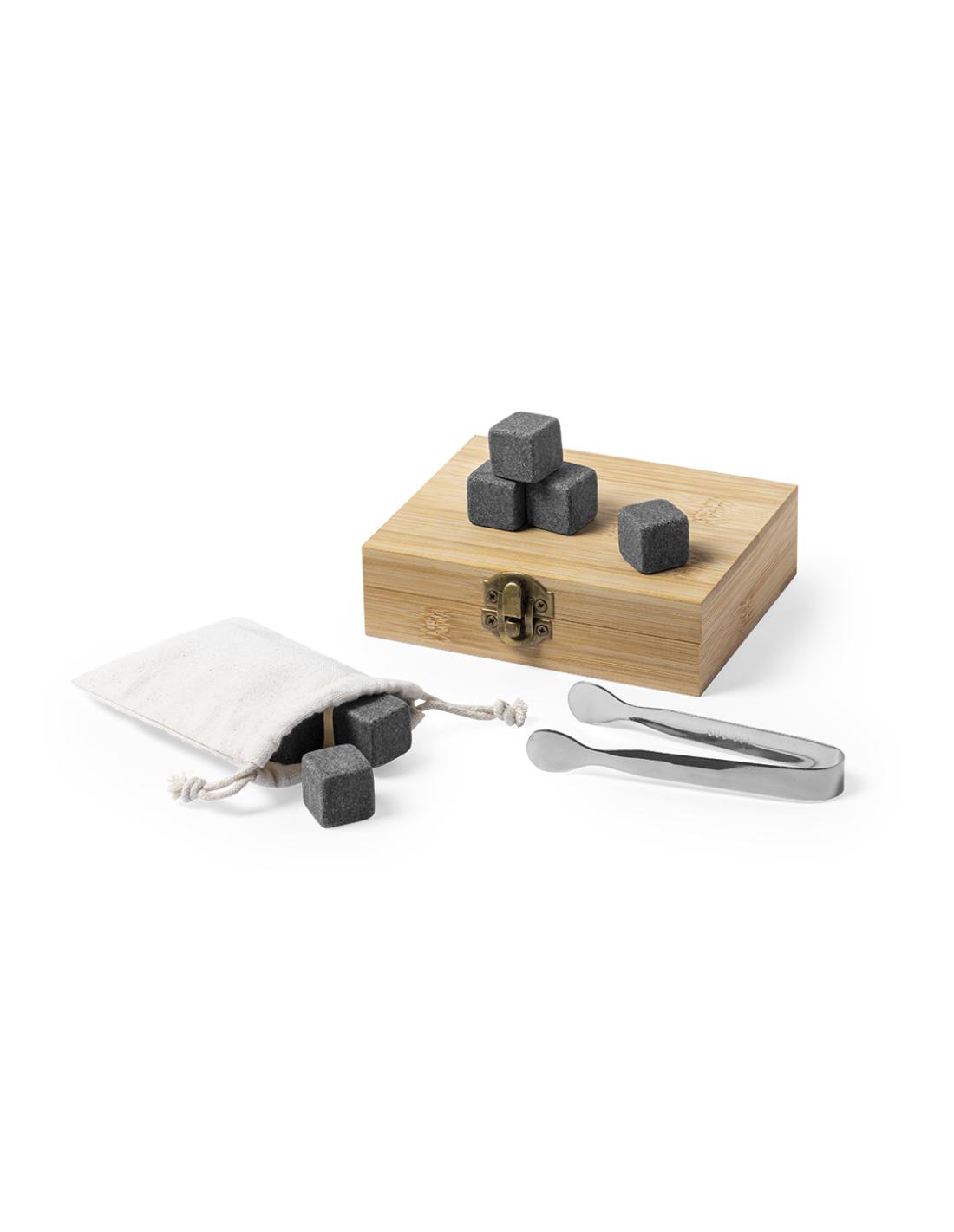 Set de 9 cubitos reutilizables. Fabricados en piedra natural esteatita, también conocida como piedra o roca de jabón, que mantiene la bebida fría sin alterar sus propiedades al no diluir su contenido en agua, además de mantener el sabor original de la misma. Incluye pinzas de acero inoxidable y funda de algodón. Presentado en estuche de bambú.
