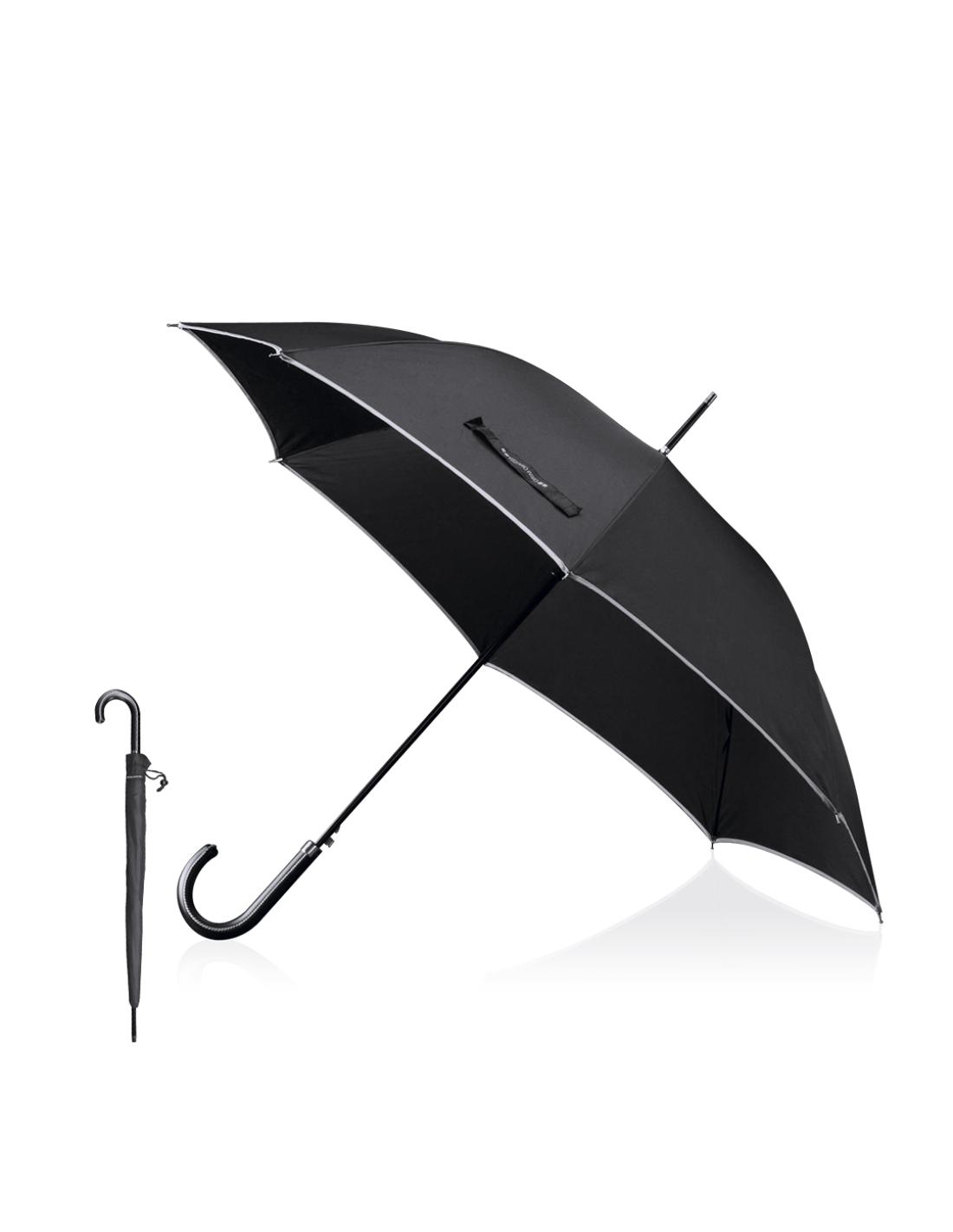 Paraguas de Antonio Miró de 8 paneles, con elegante diseño en color negro con ribetes en color blanco. De 100cm de diámetro, con apertura automática y en resistente material pongee. Con varillas metálicas en color negro, cierre de velcro y mango de suave tacto en polipiel. Presentado en funda con logotipo de la marca y cinta con accesorio de ajuste.
