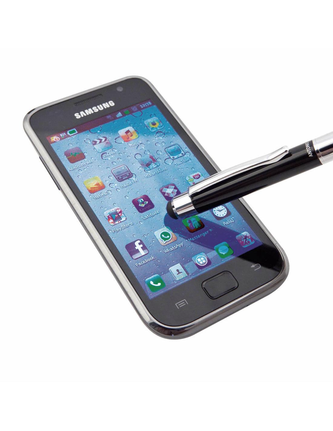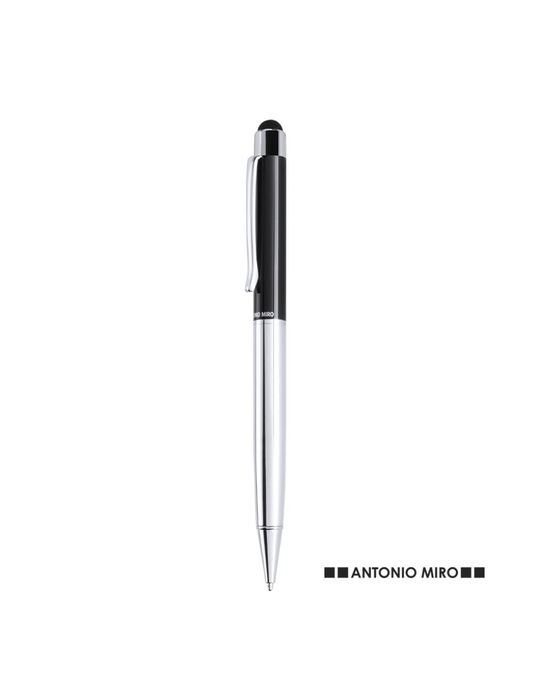 Bolígrafo puntero de Antonio Miró de mecanismo giratorio con suave cuerpo metálico, de elegante combinación de colores en plateado y negro. Clip y punta de diseño a juego. Presentado en estuche individual negro con logotipo de la marca. Tinta azul.