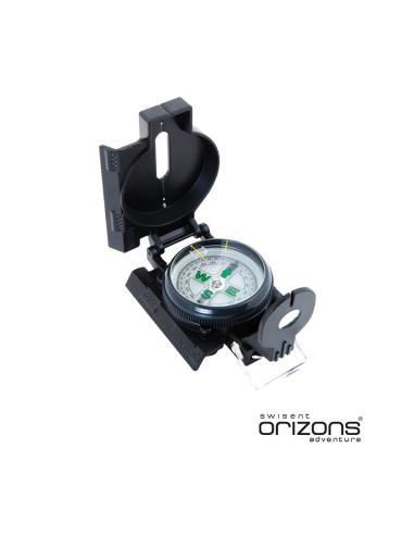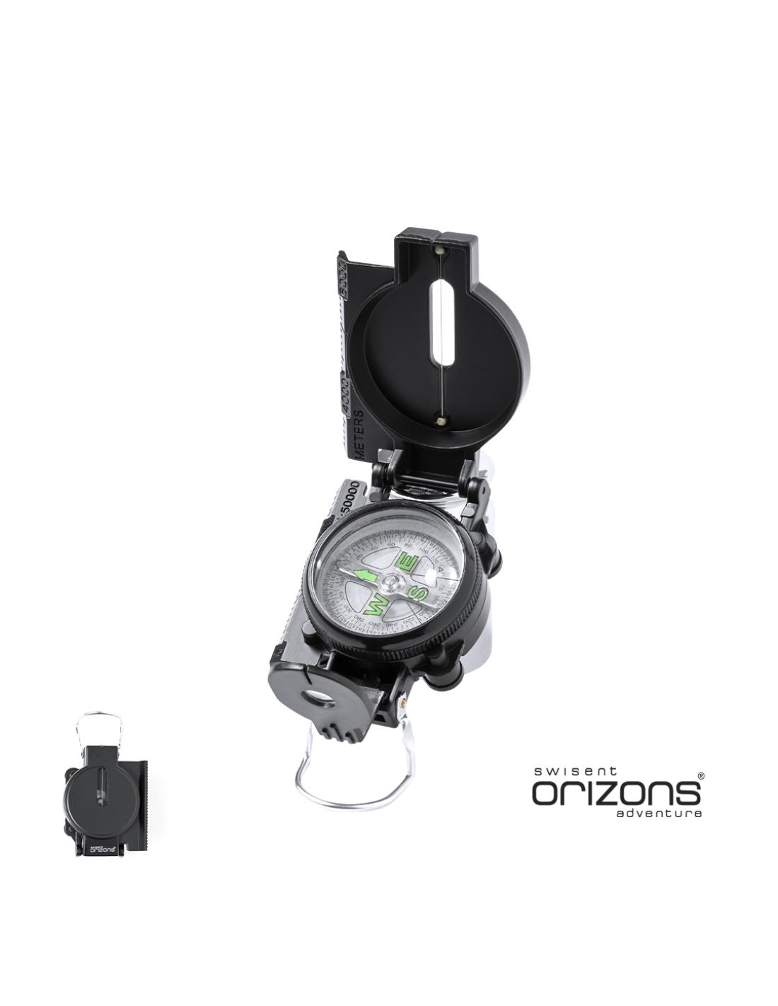 Brújula de Orizons de alta precisión con cuerpo en resistente aluminio, accesorio de fijación y presentada en atractiva caja de diseño con logotipo de la marca.