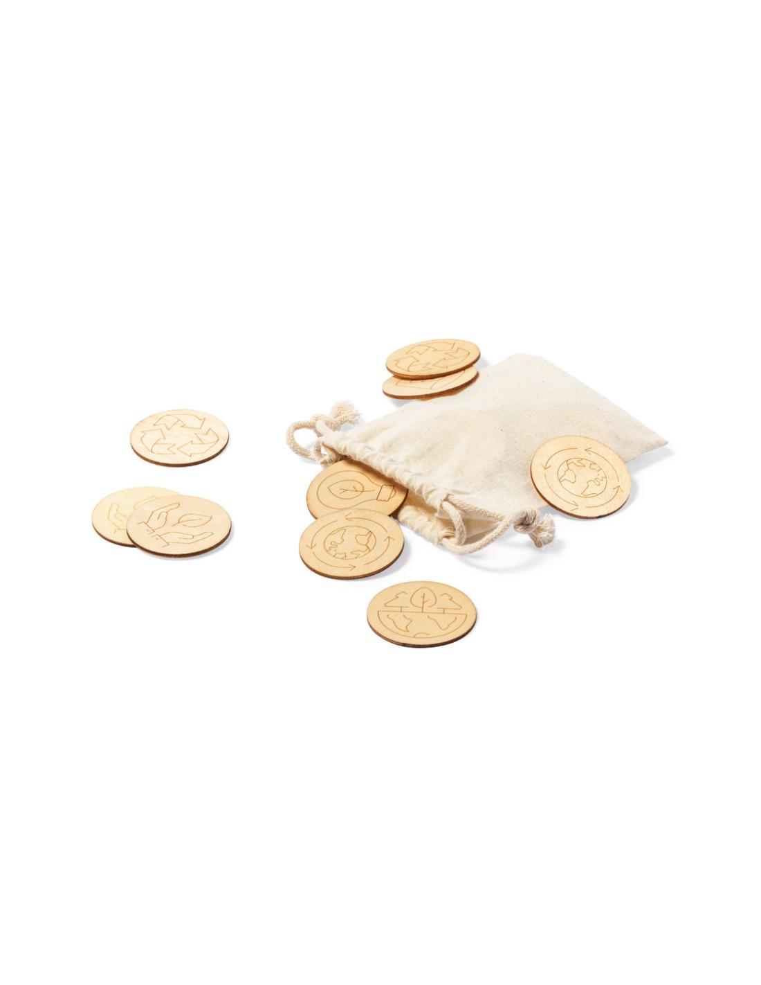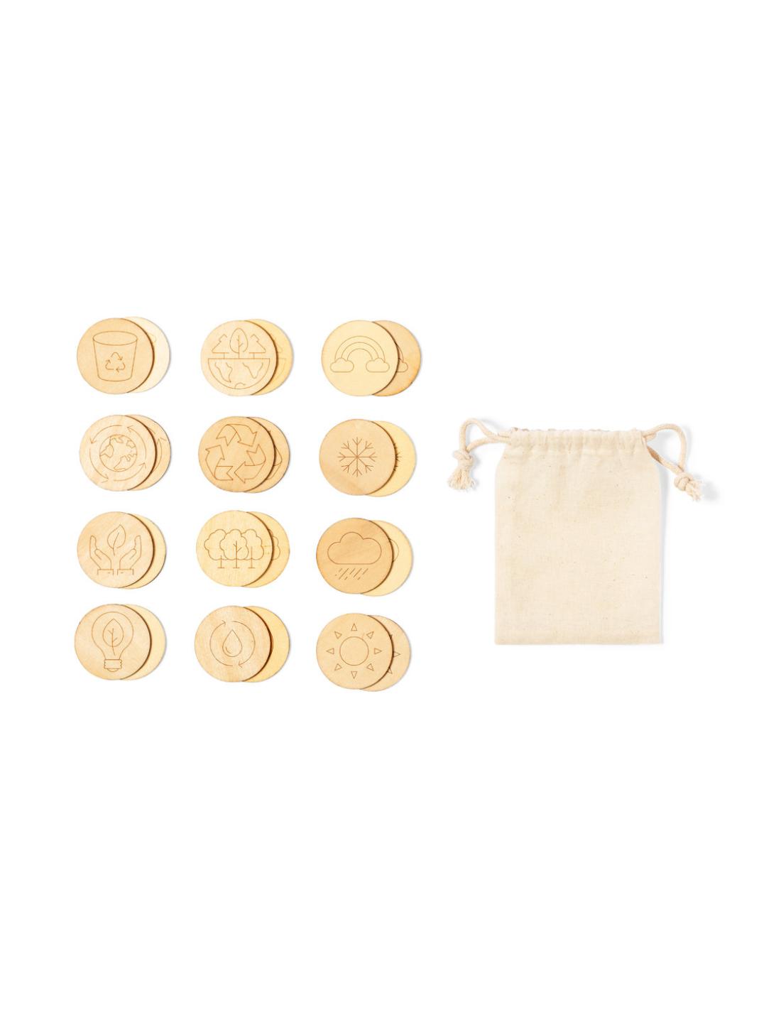 Juego de concienciación ecológica fabricado en madera. Set de 24 piezas en bolsa de transporte 100% algodón con cordones de cierre a juego.