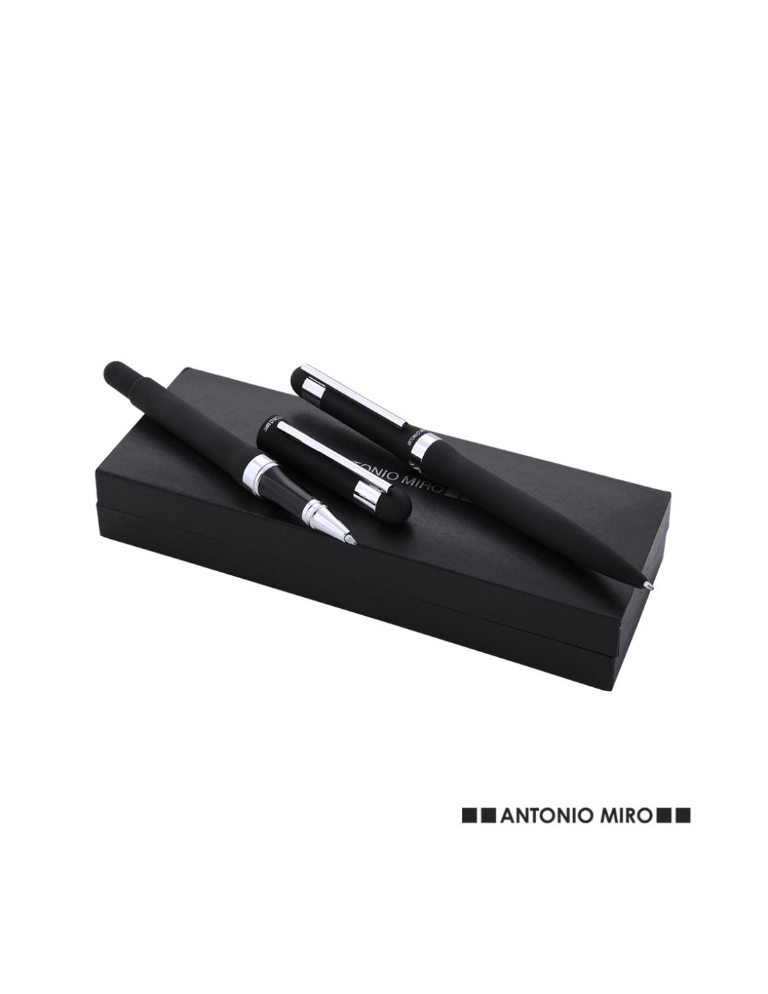 Elegante set de Antonio Miró con bolígrafo de mecanismo giratorio y roller de capucha y original anilla en sobrio diseño. De cuerpo metálico en acabado negro brillante con clip plateado. Presentado en elegante estuche individual en color negro con logotipo de la marca y funda. En tinta azul.