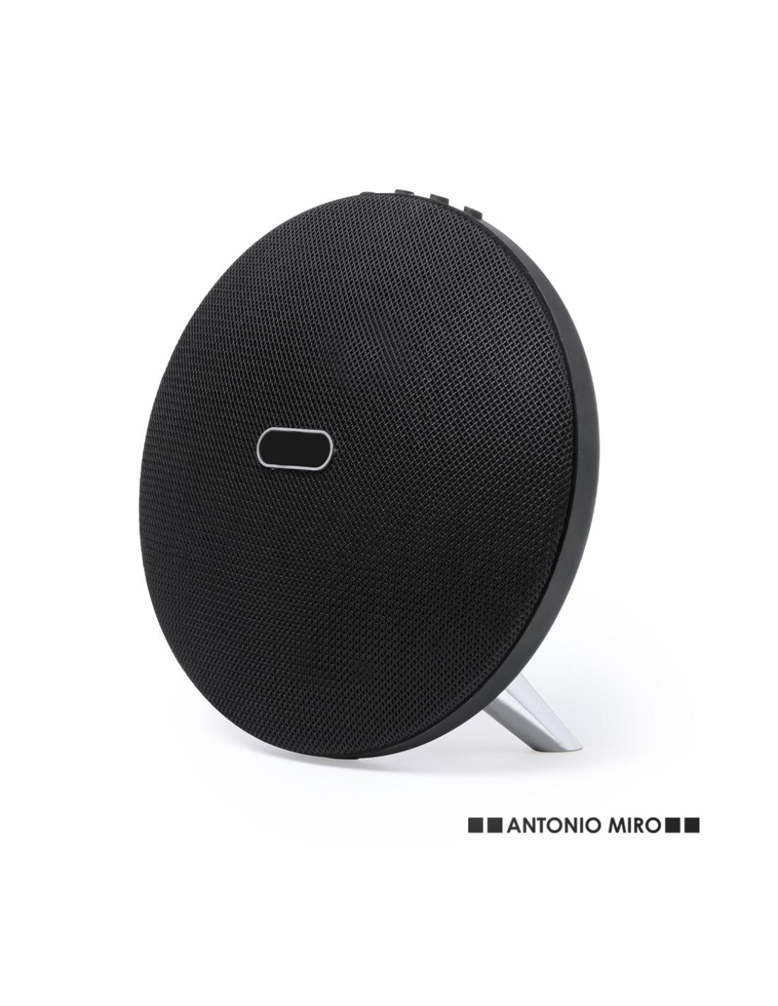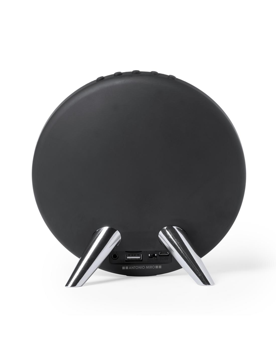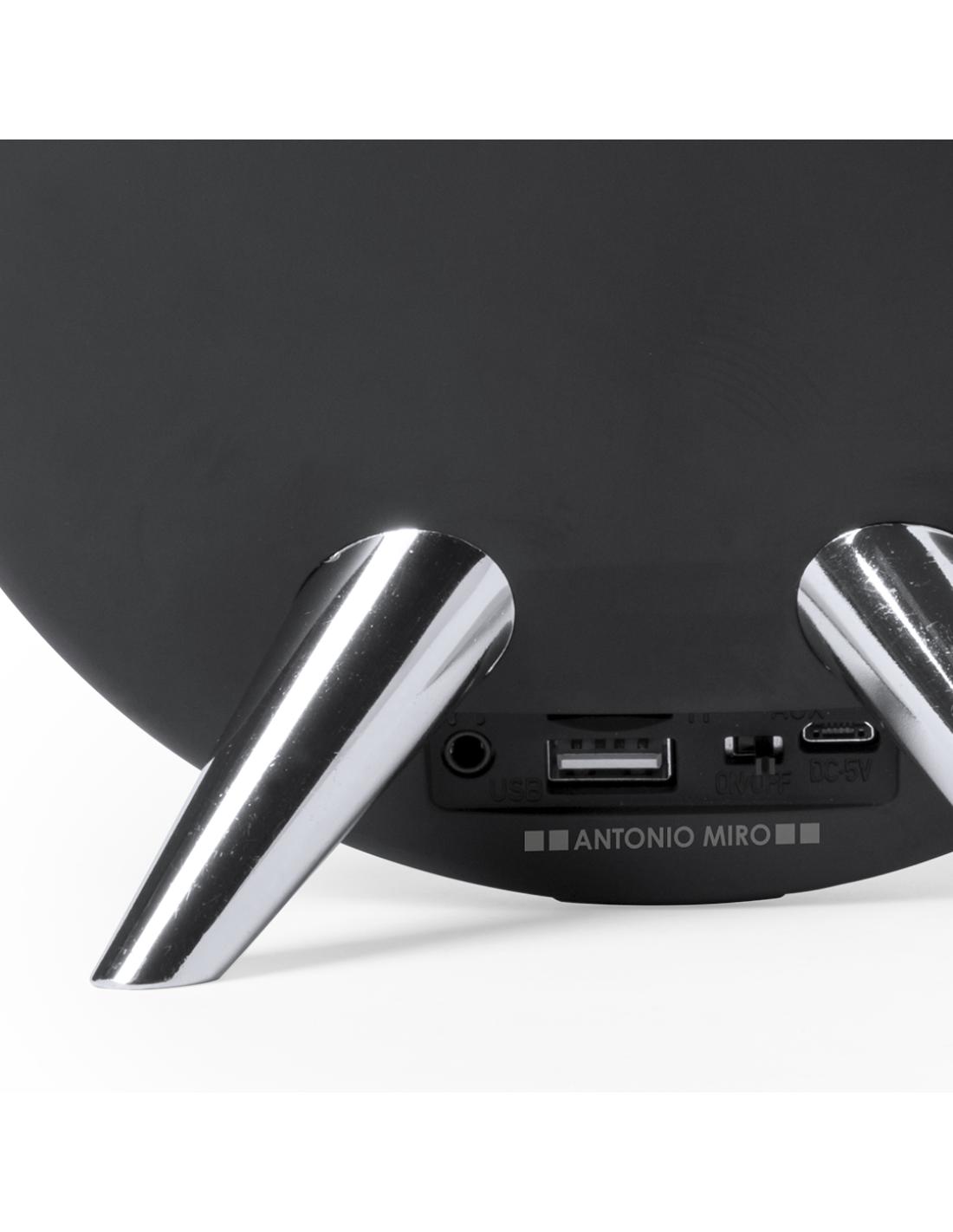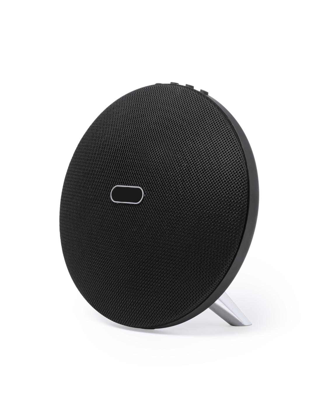 Altavoz de conexión Bluetooth en elegante acabado de color negro con accesorioss en plateado y original diseño circular. Ofrece 8W de potencia, tiene función de manos libres, una ranura para tarjetas micro SD de hasta 32 GB de capacidad y entrada auxiliar de línea mediante conexión jack de 3,5mm. Compatible con iOS y Android, incluye cable de carga mini USB, cable auxiliar jack de 3,5mm y viene presentado en atractiva caja de diseño. Con soportes de goma antideslizantes en la base.