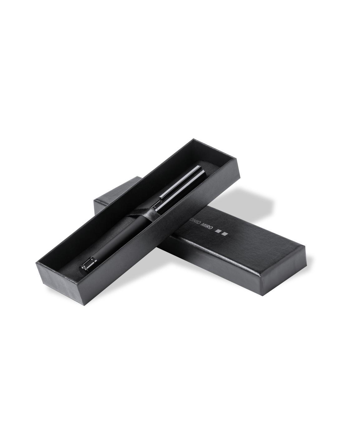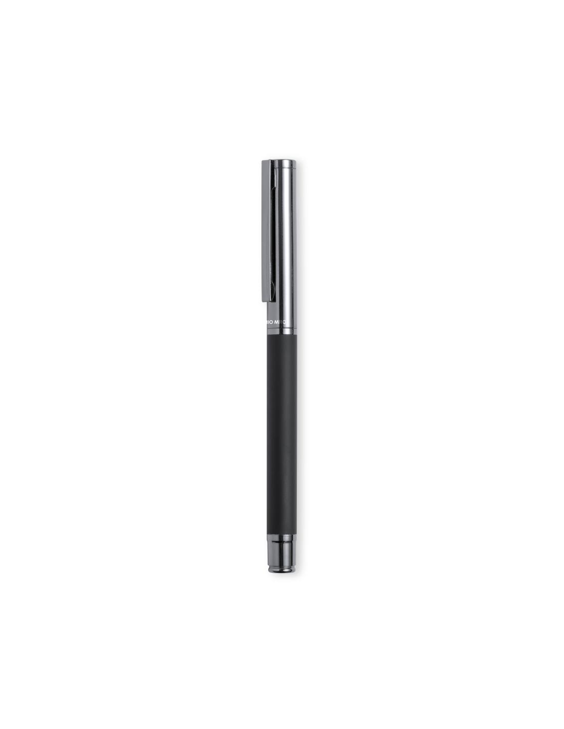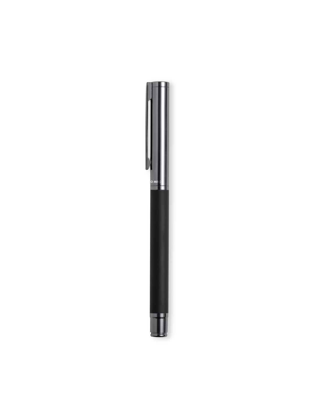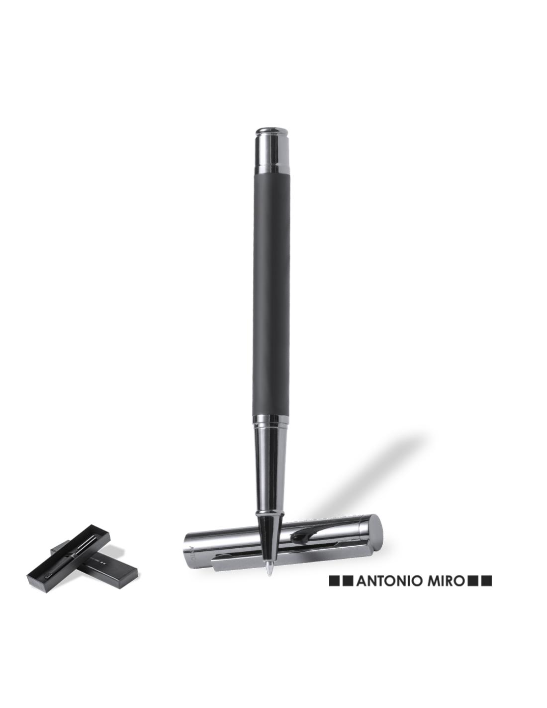 Roller de Antonio Miró fabricado en metal, con cuerpo en negro mate. Detalles y capucha en cromado con logotipo de la marca. De cartucho jumbo y en tinta azul. Presentado en elegante y resistente caja individual negra con logotipo Antonio Miró y funda a juego.