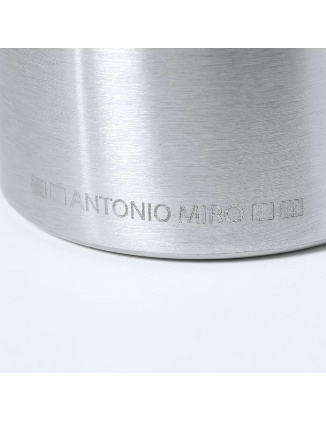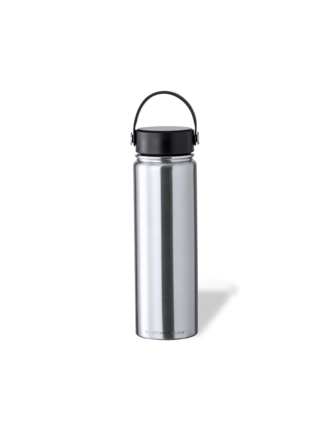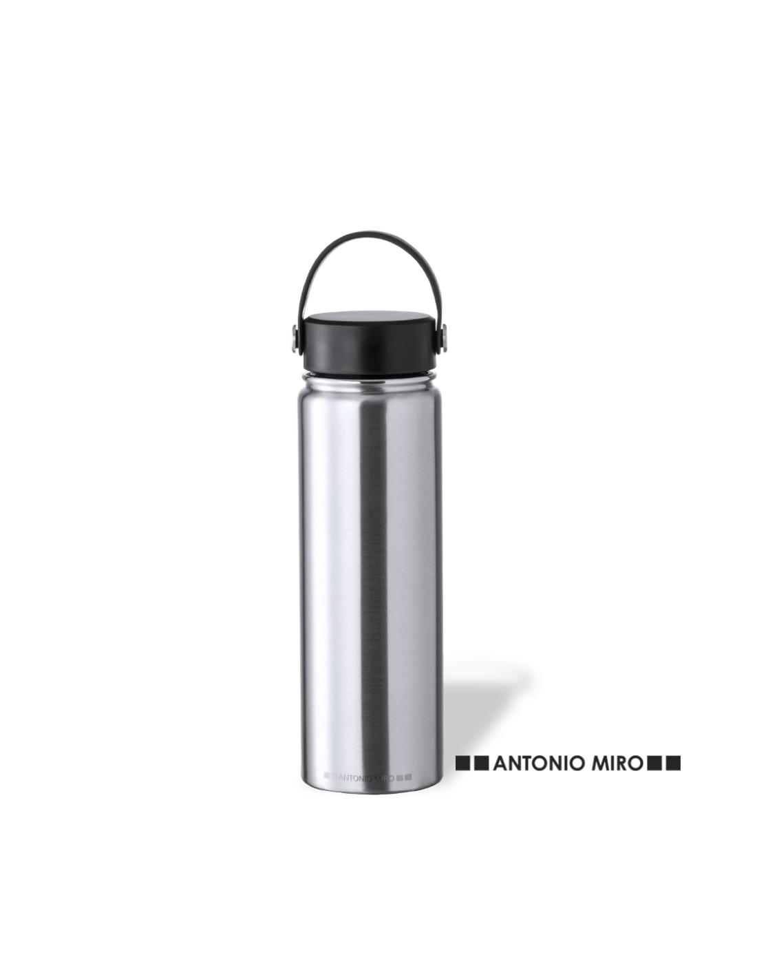 Bidón térmico de Antonio Miró y 650 ml de capacidad. Fabricado en acero inox de doble pared y acabado satinado. Con tapón a rosca en negro y cinta de transporte a juego en silicona. Con logotipo Antonio Miró en cuerpo y presentado en caja individual negra con logotipo de la marca.Disponible manual de instrucciones en español e inglés.