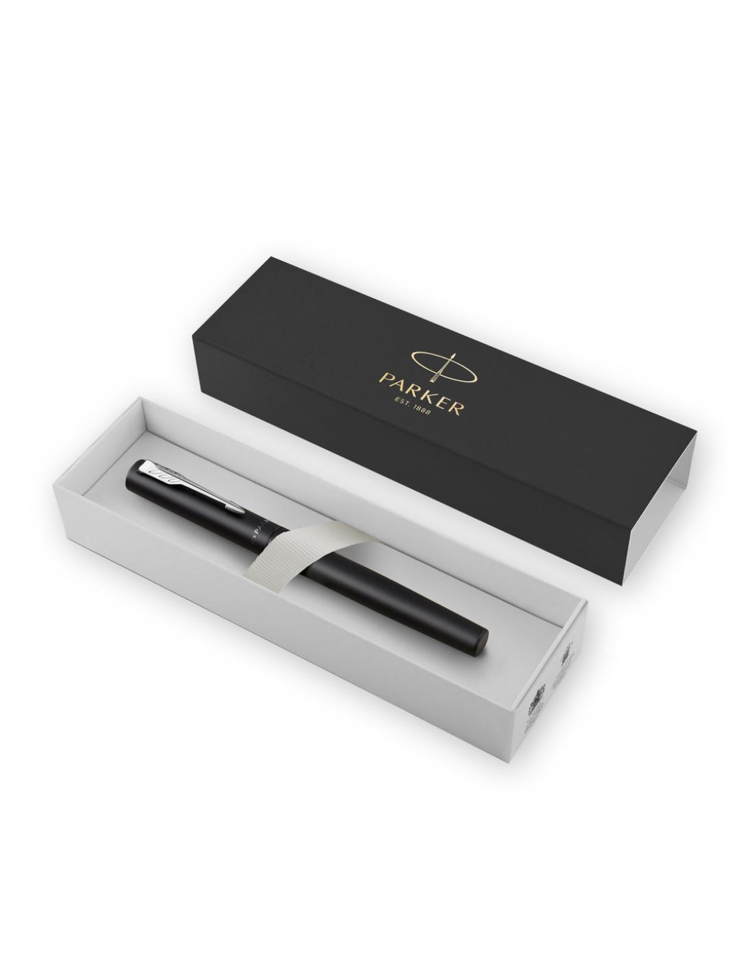 Roller Parker Vector XL, fabricado en acero inox pulido, resaltado con un adorno cromado y el inconfundible clip con la forma icónica en punta de flecha de la marca en la capucha. En tinta negra y presentado en estuche individual negro con logotipo Parker. Escritura limpia y homogénea, sin saltos, y de gran gran fluidez e intensidad. Su práctica forma cilíndrica y su resistente plumín fino de acero inoxidable permiten escribir con gran comodidad y precisión, convirtiendo al Vector XL en un instrumento de escritura tan accesible como versátil.