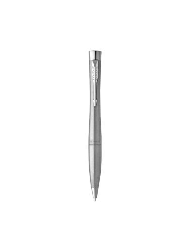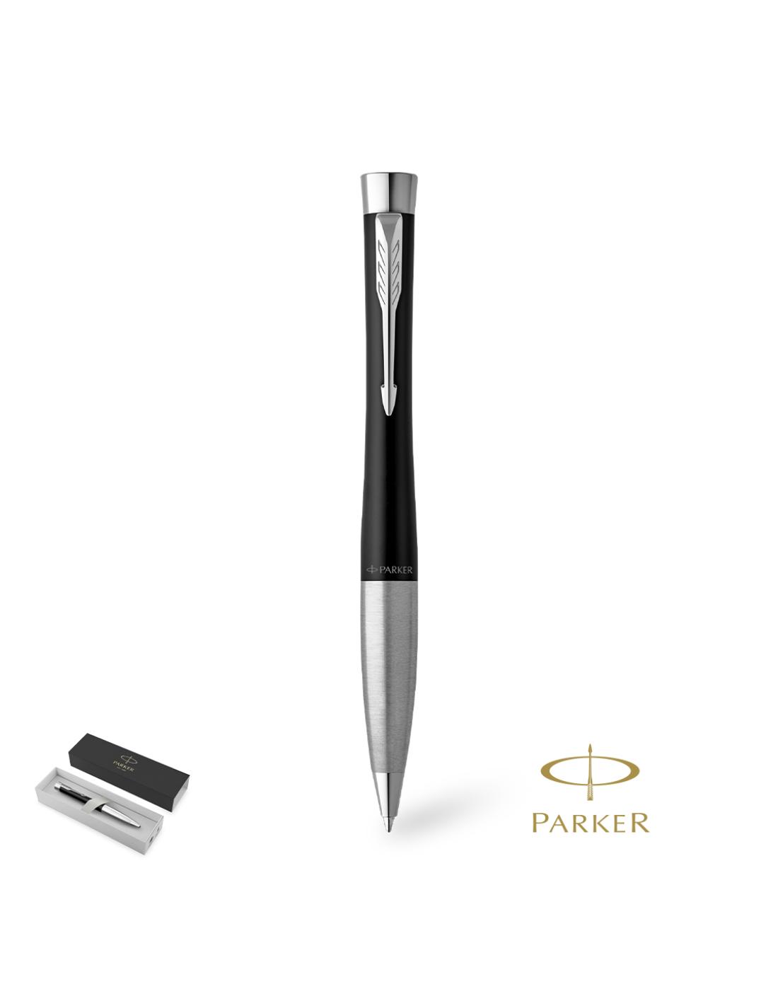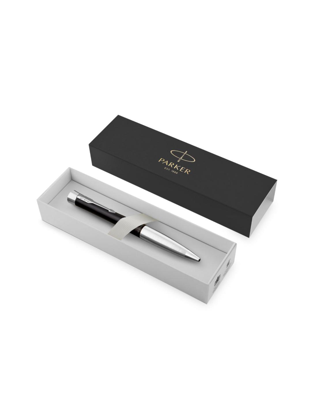 Bolígrafo Parker Urban Twist, fabricado en metal, con adornos cromados, y el inconfundible clip con la forma icónica en punta de flecha de la marca. De mecanismo giratorio y en tinta azul, con elegantes curvas en forma de reloj de arena que le dan un aspecto llamativo y moderno. Presentación en estuche individual negro con logotipo Parker. Con tinta Parker QuinkFlow, que ofrece una escritura fluida y fiable sobre el papel.