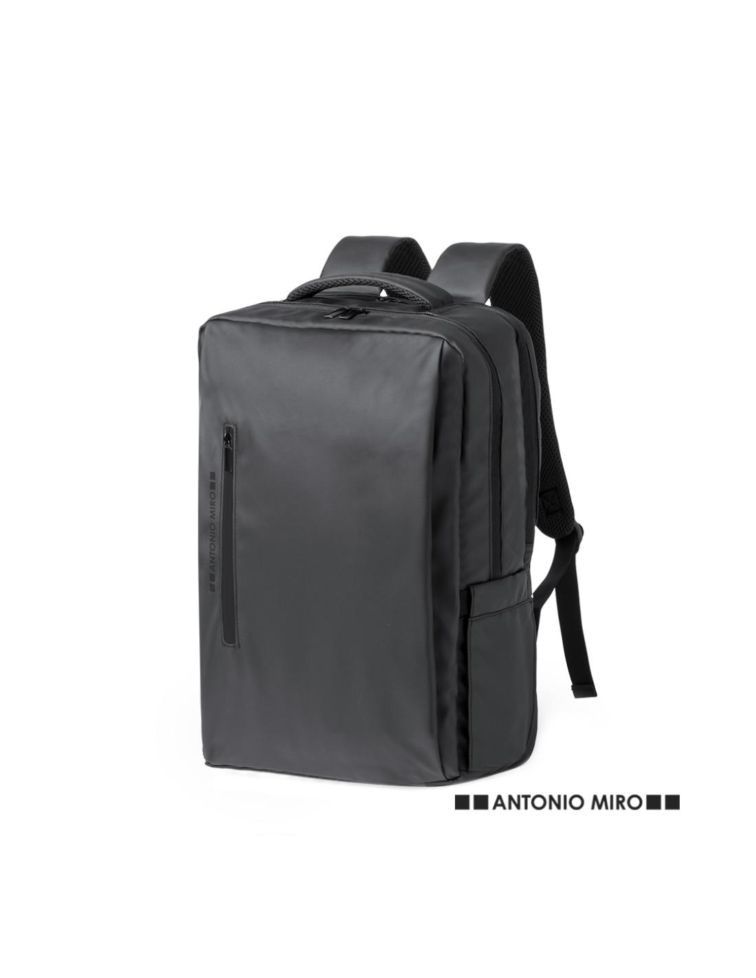 Mochila de Antonio Miró de calidad premium en resistente polipiel de sobrio diseño en color negro. Con cierre de cremallera doble, bolsillo frontal y asa reforzada acolchada. Con acolchado ergonómico en espalda y cintas de hombros, incluye compartimento interior acolchado para portátil de hasta 15 pulgadas y para tablets de hasta 10 pulgadas. Además, con bolsillo antirrobo con cierre de cremallera en la parte trasera. Fundas interiores para bolígrafos y smartphone. Con logotipo de la marca en frontal.