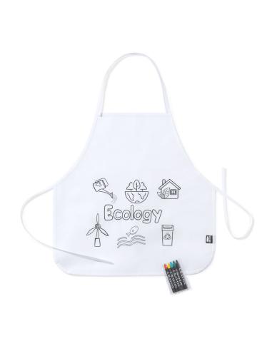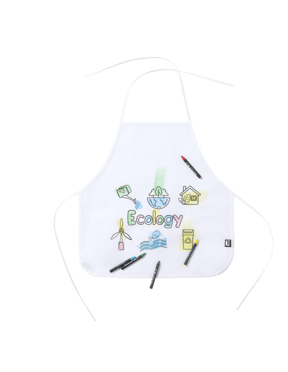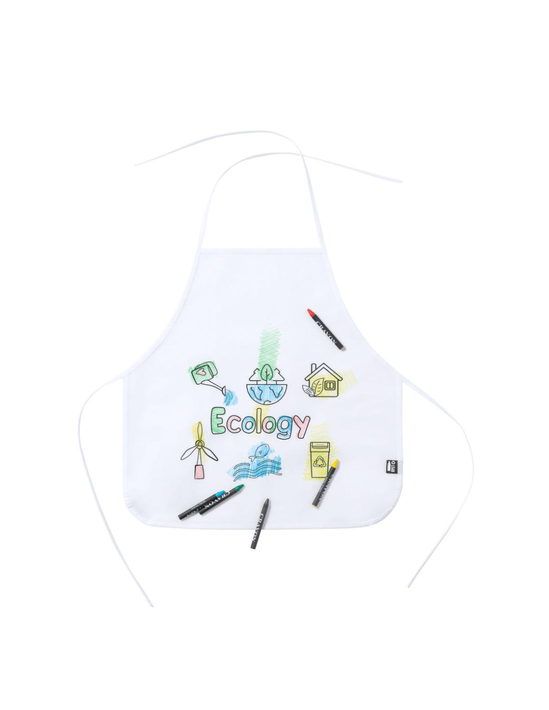 Delantal fabricado en non-woven RPET de color blanco, especialmente diseñado para colorear con ceras. Incluye 5 ceras en variados colores. Con cintas de ajuste en cuello y cintura. Distintivo RPET en etiqueta exterior.El material RPET se elabora a partir de plástico reciclado, para así fomentar la reutilización de residuos plásticos y ayudar a la sostenibilidad del planeta.