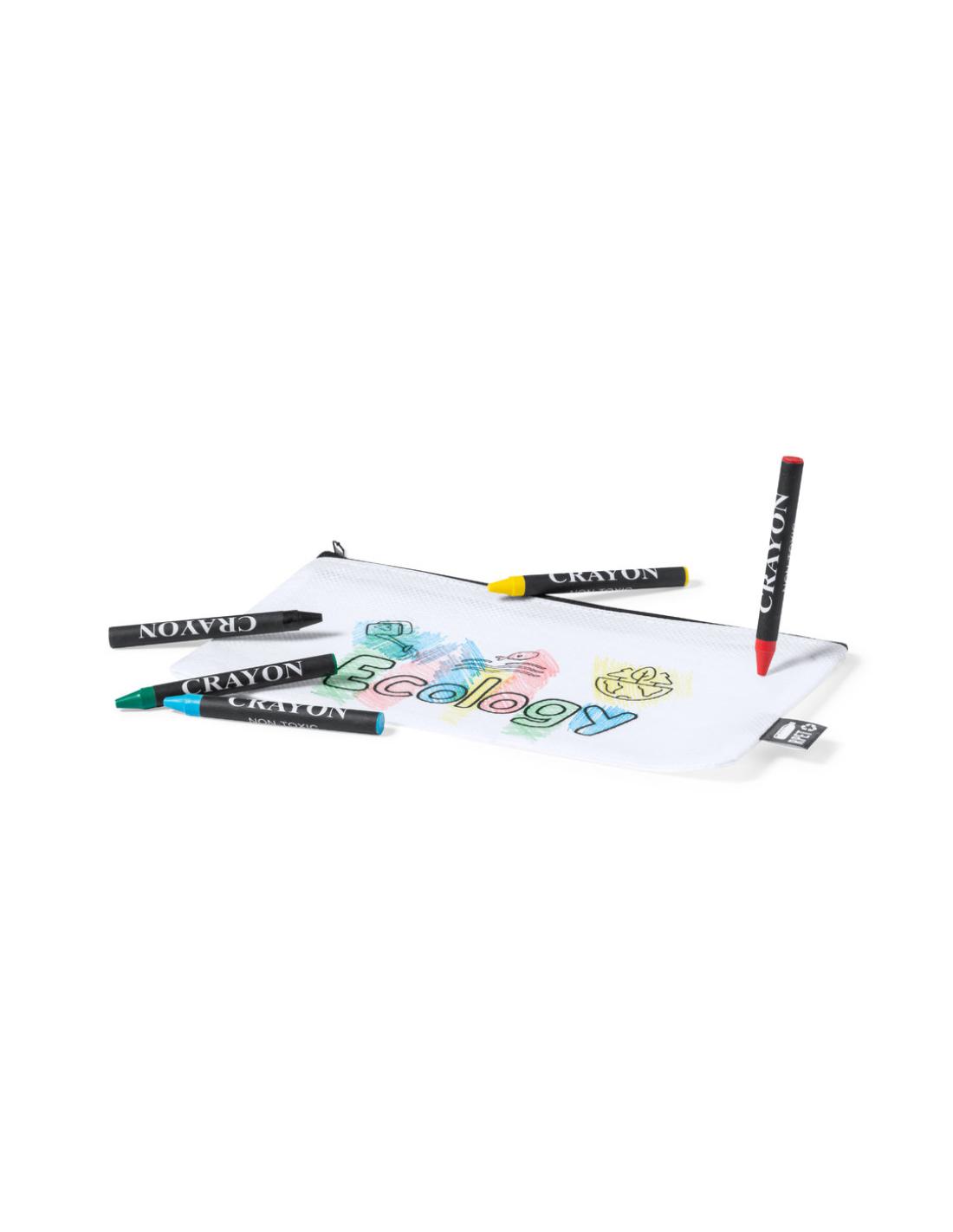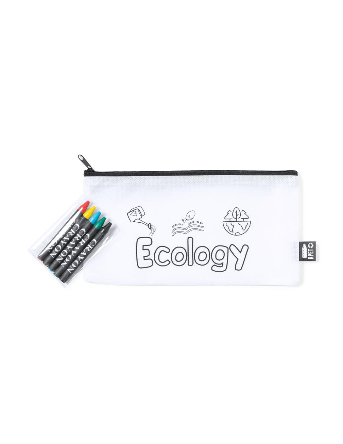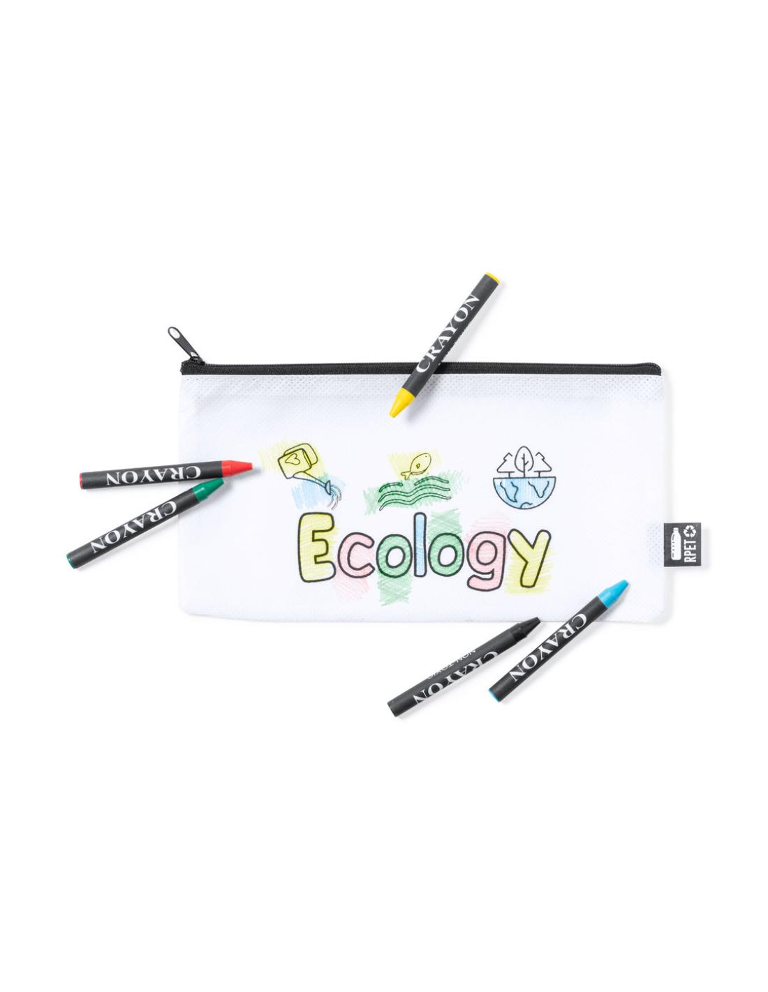 Estuche fabricado en non-woven RPET de color blanco, con cierre de cremallera y tirador metálico. Especialmente diseñado para colorear con ceras. Incluye 5 ceras en variados colores y distintivo RPET en etiqueta exterior.
